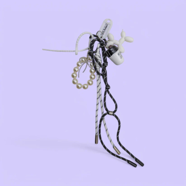 Ein zeitloser schwarz-weißer Taschenanhänger mit einer Miniatur-Kaffeetasse, Perlen und einem Ballonhund. Das perfekte Accessoire für einen schicken und grafischen Look.