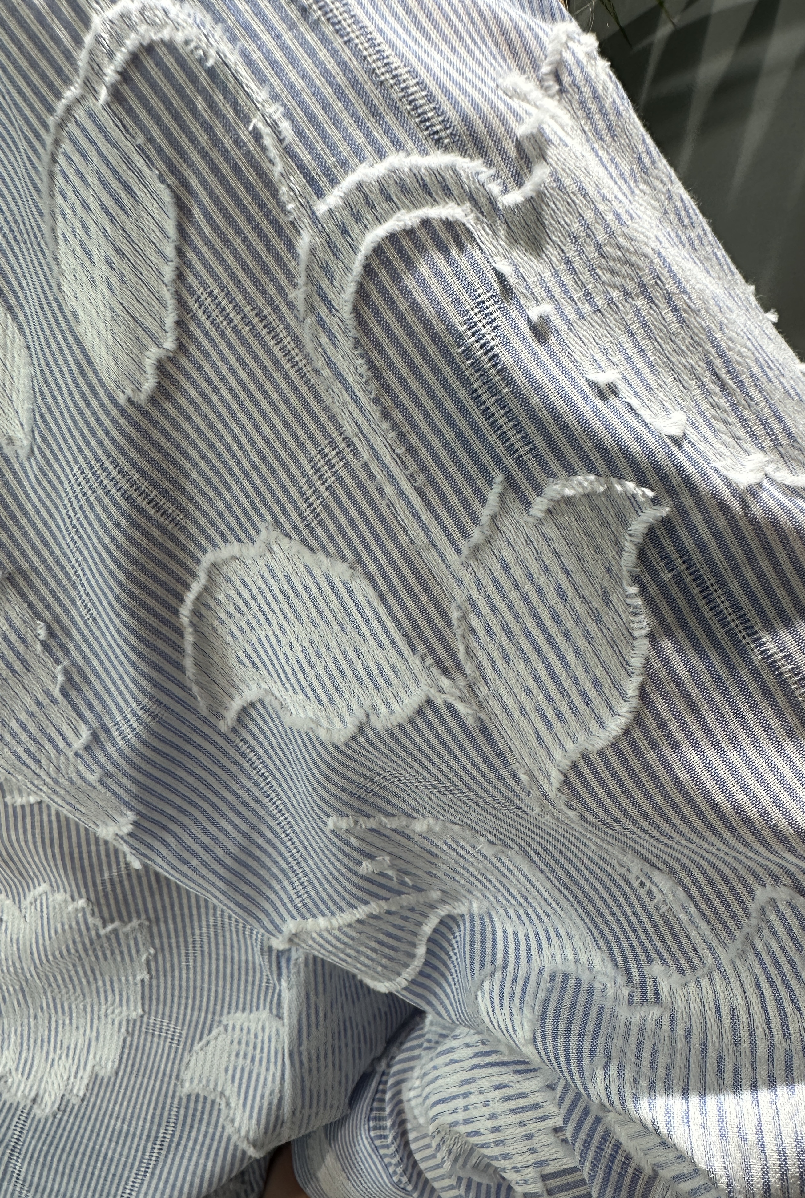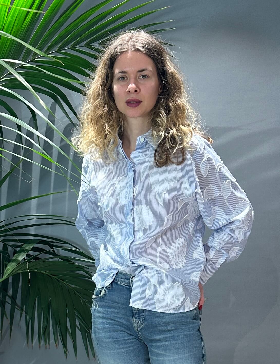Edle Blau-Weiß gestreifte Bluse mit eingewebten Blüten. 100% Baumwolle. Fällt größengenau aus.