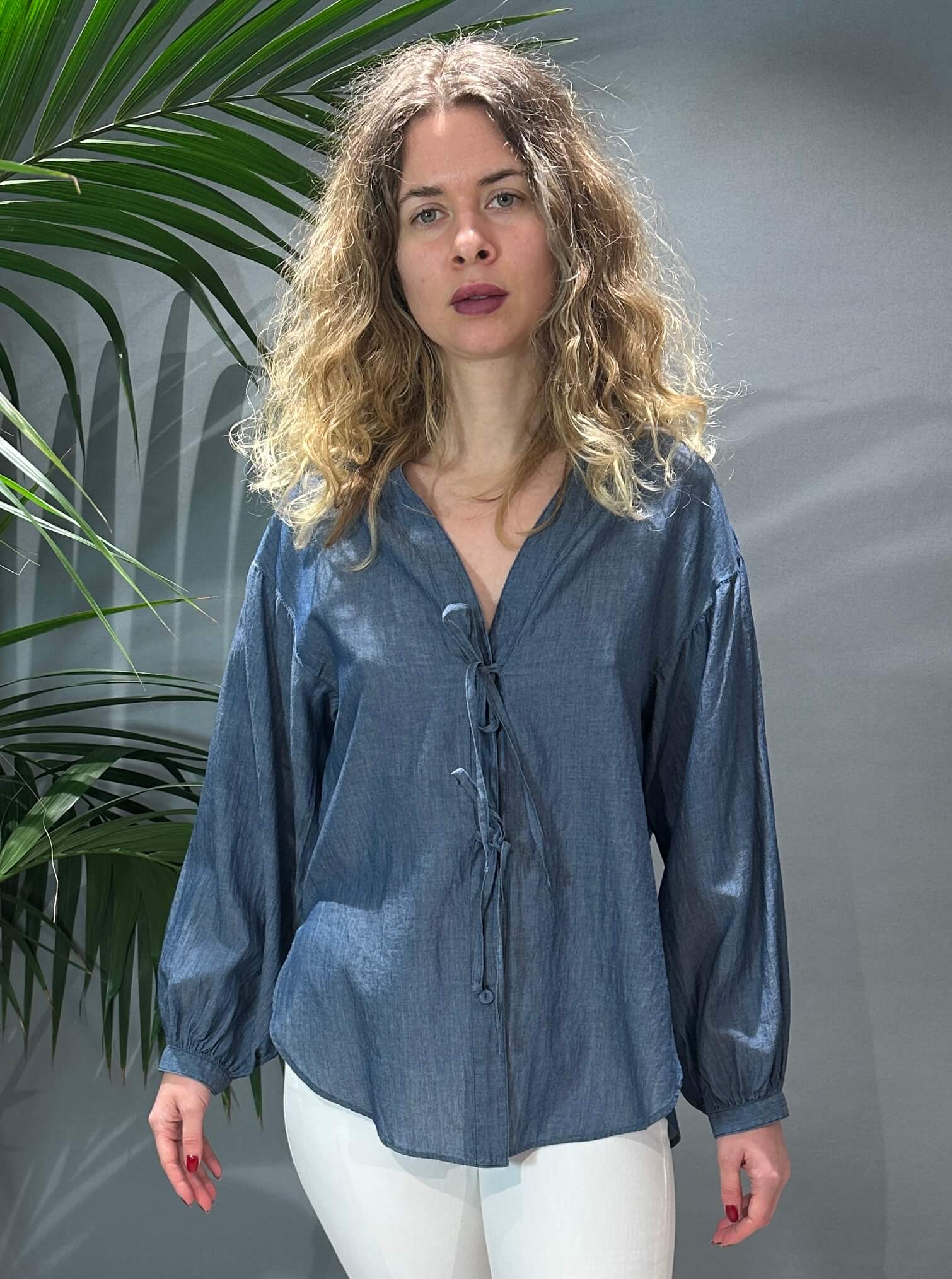 Edle Baumwollbluse in Denim Blue mit Knöpfen und Bändchen. 100% Baumwolle. Fällt größengenau aus. mehr