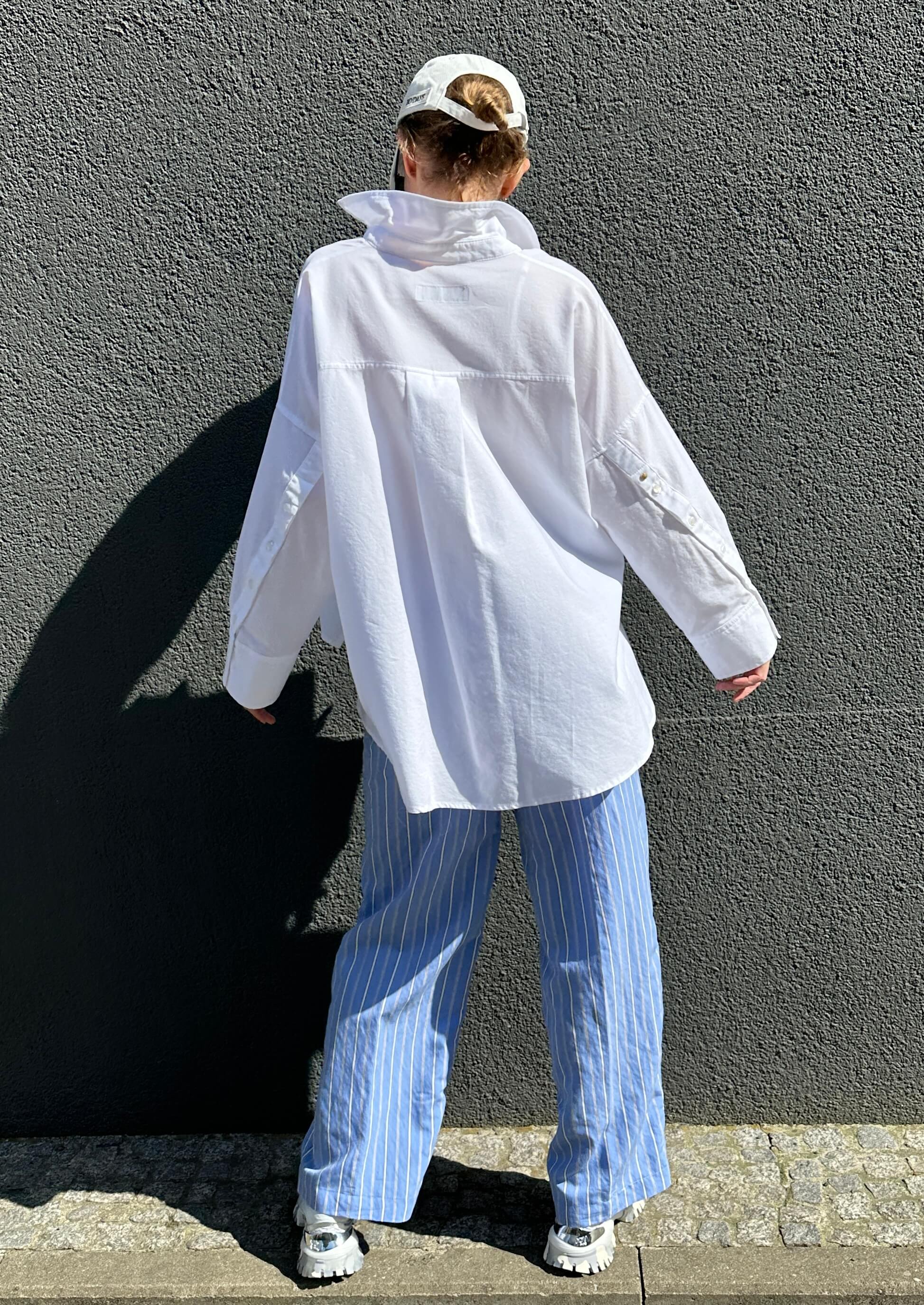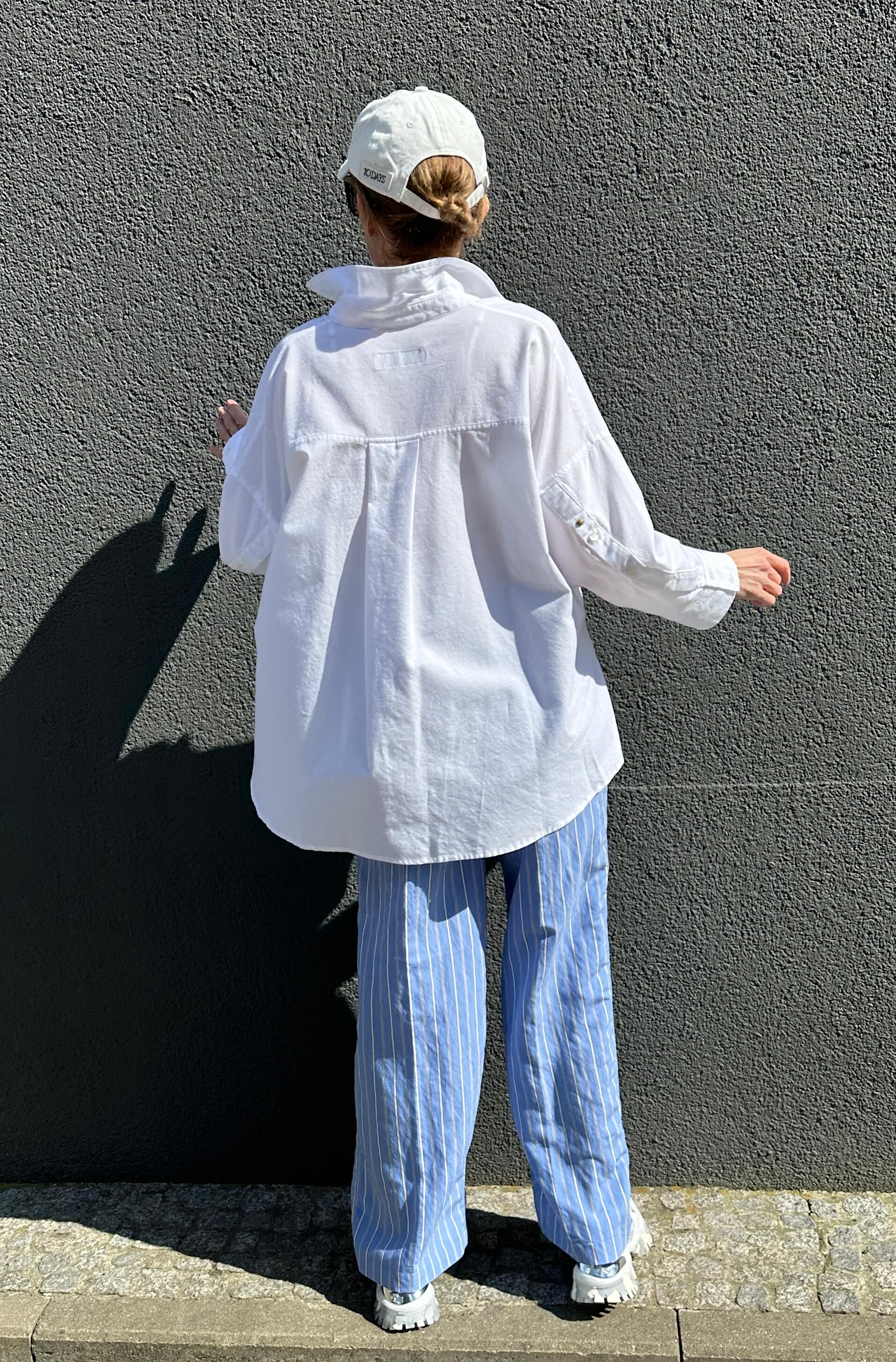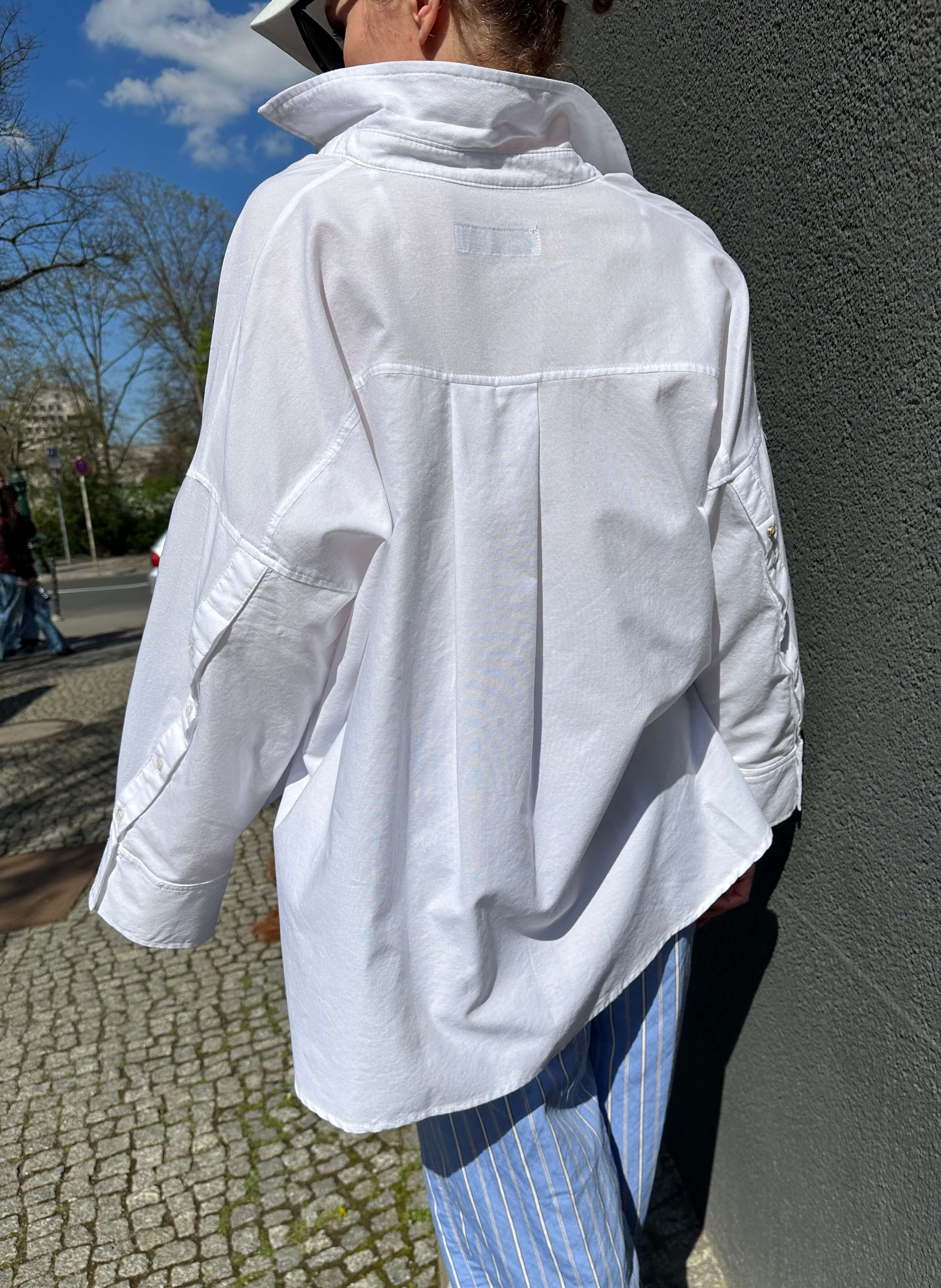 Coole oversize Bluse im Japan Style in Weiß mit schräg geknöpften Ärmel, verstellbare Brusttasche. 100% Baumwolle. Fällt groß aus.