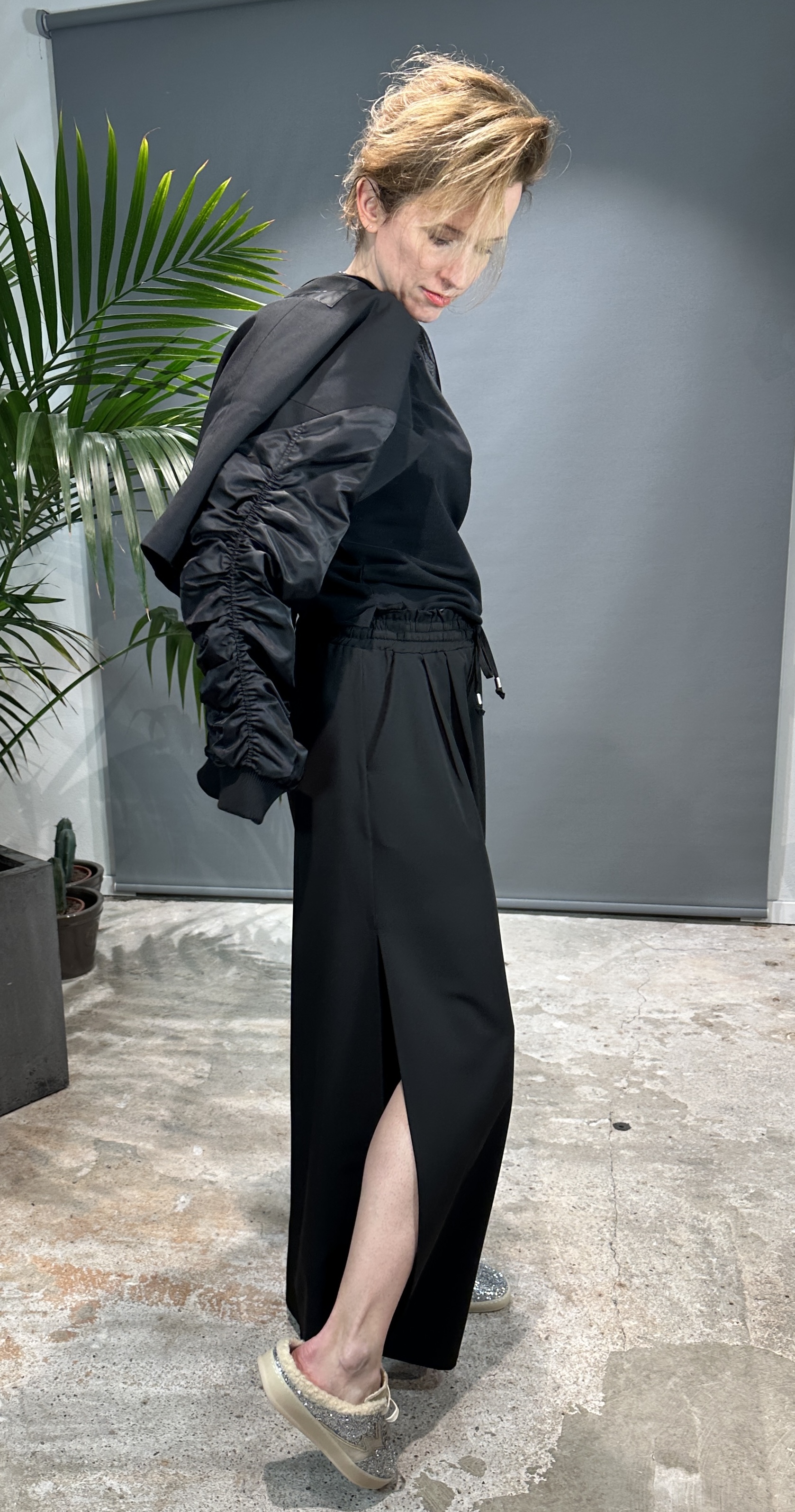 Fließende weite Hose – Seitenschlitze – Taschen – Knöpfe und Knopflöcher unten.