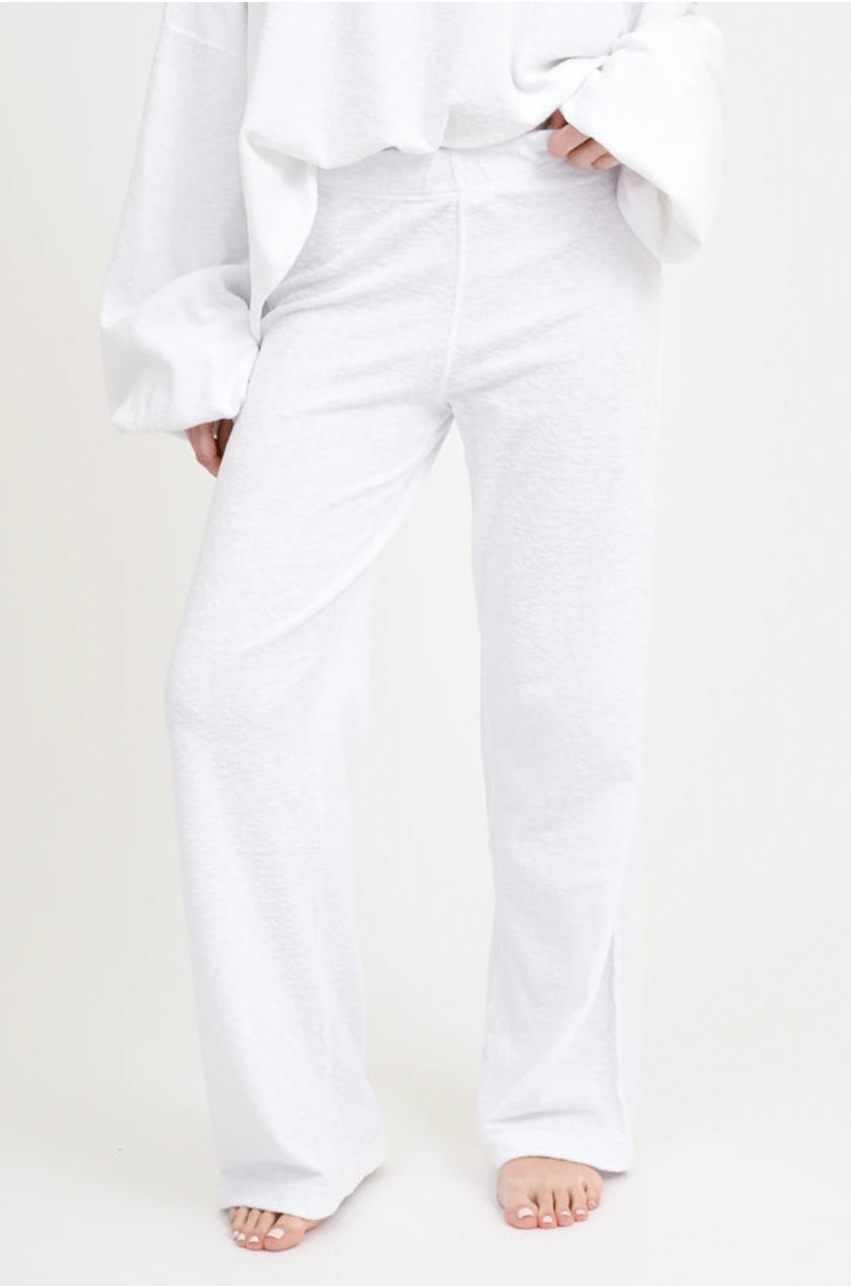 Kuscheligweiche Frottee Sweatpant in Weiß mit Gummibund und kleinem Elefanten Stitching auf der Rückseite. 100% organische Baumwolle. Fällt größengenau aus.