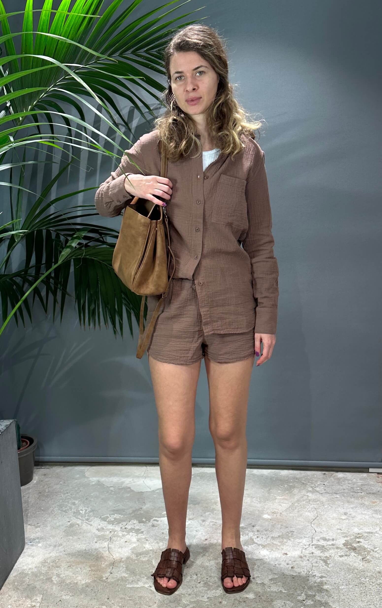 Coole Shorts aus Beach Gauze in Gusset-Roast mit Gummibund und Kordel. 100% Baumwolle. Fällt größengenau aus.