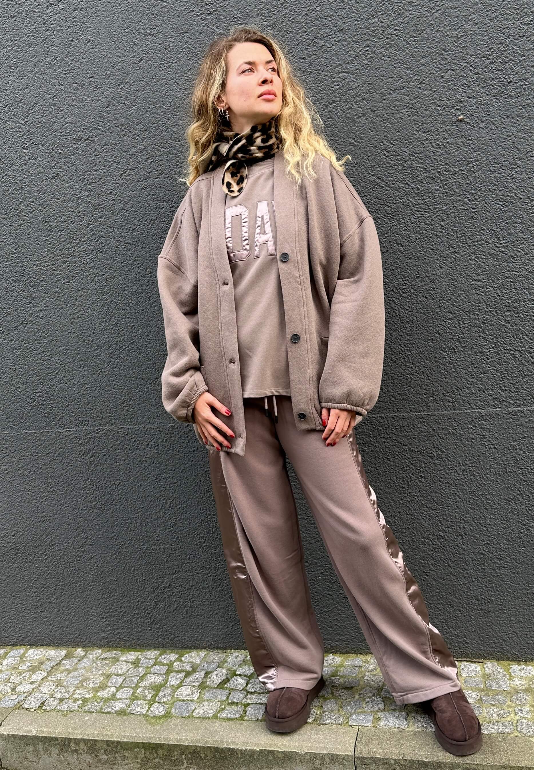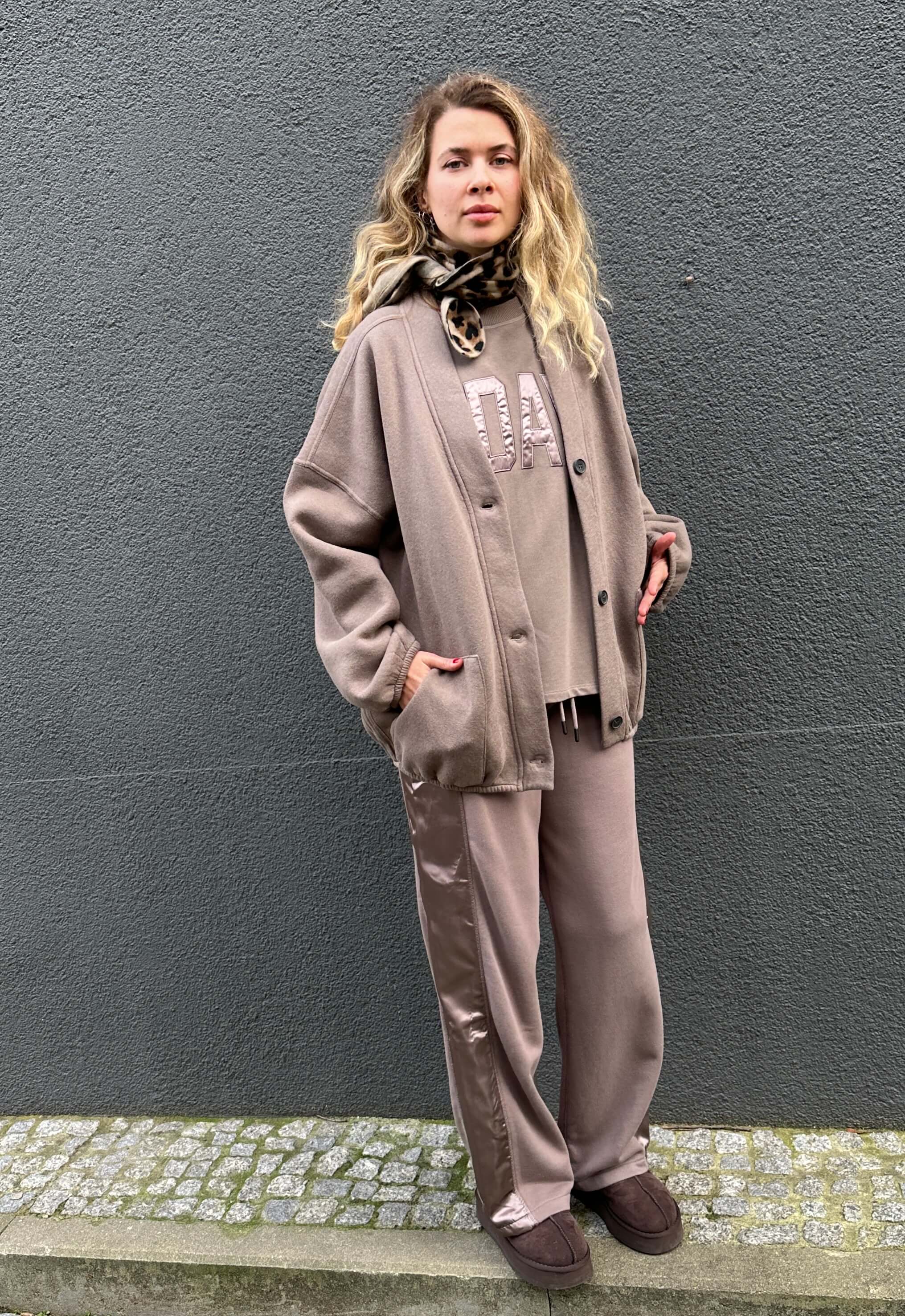 Oversized Baseballjacke aus weichem Baumwoll-Schaumfleece. Mit Knopfleiste mit 3 Knöpfen, zwei aufgenähten Taschen,