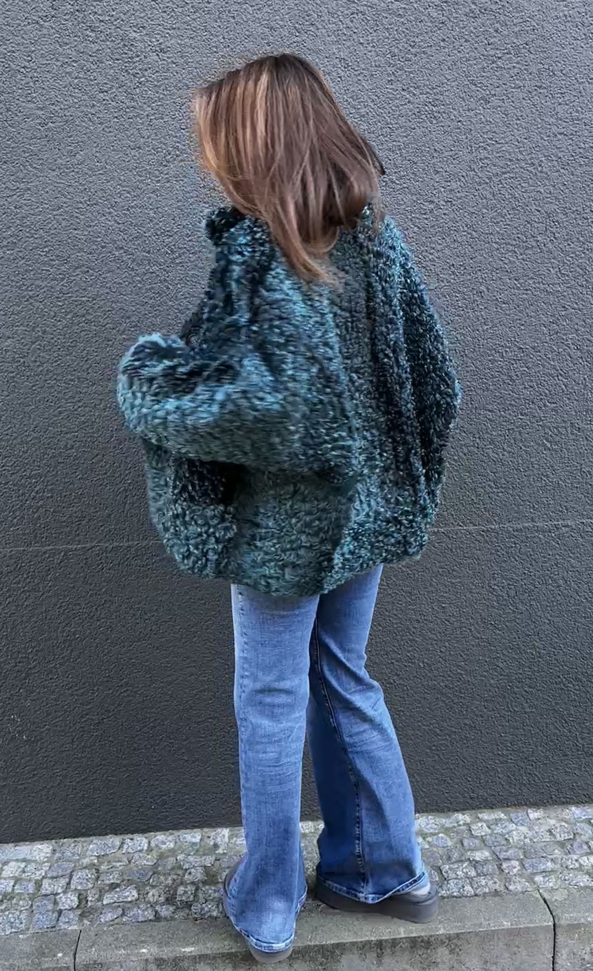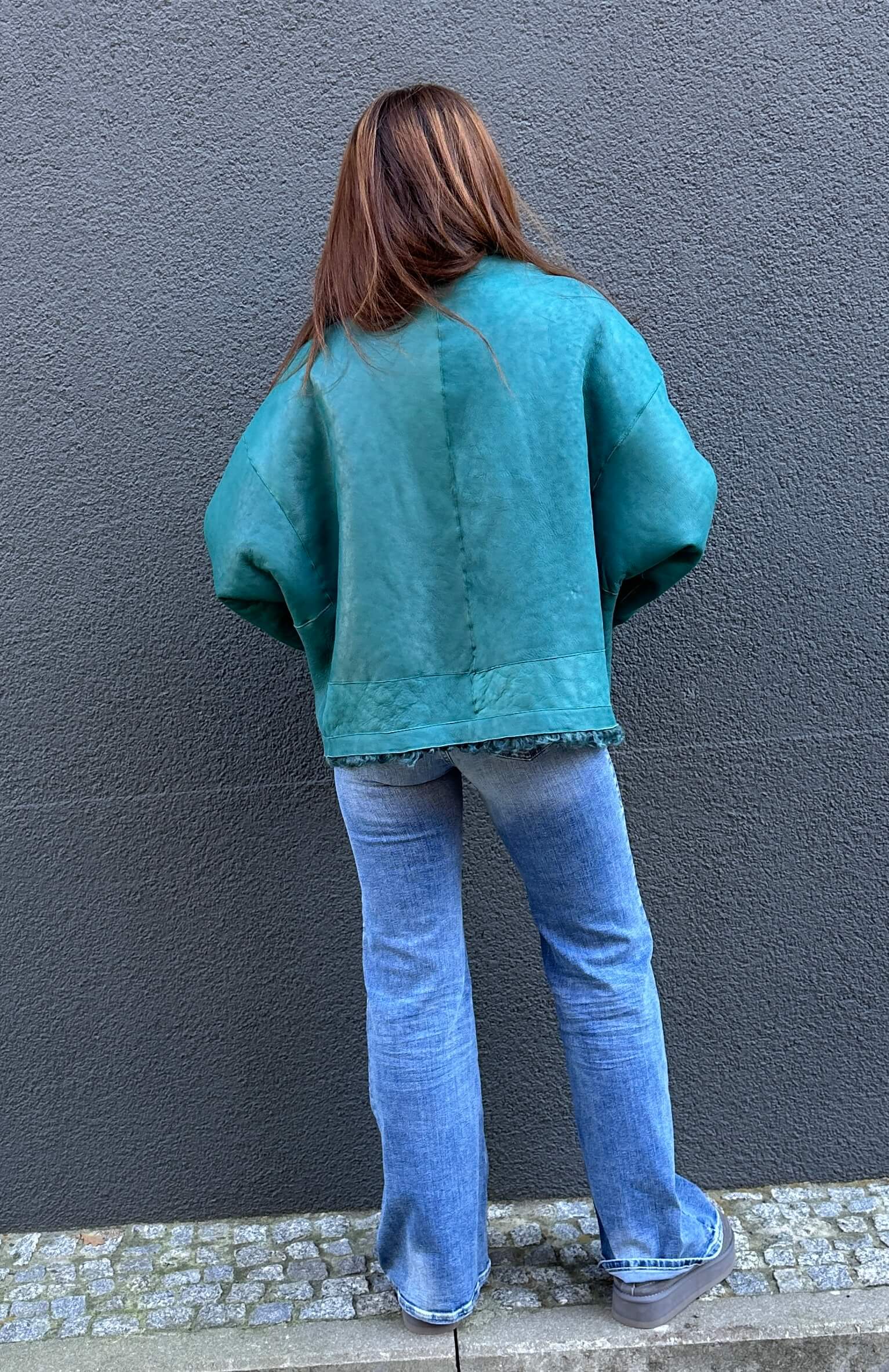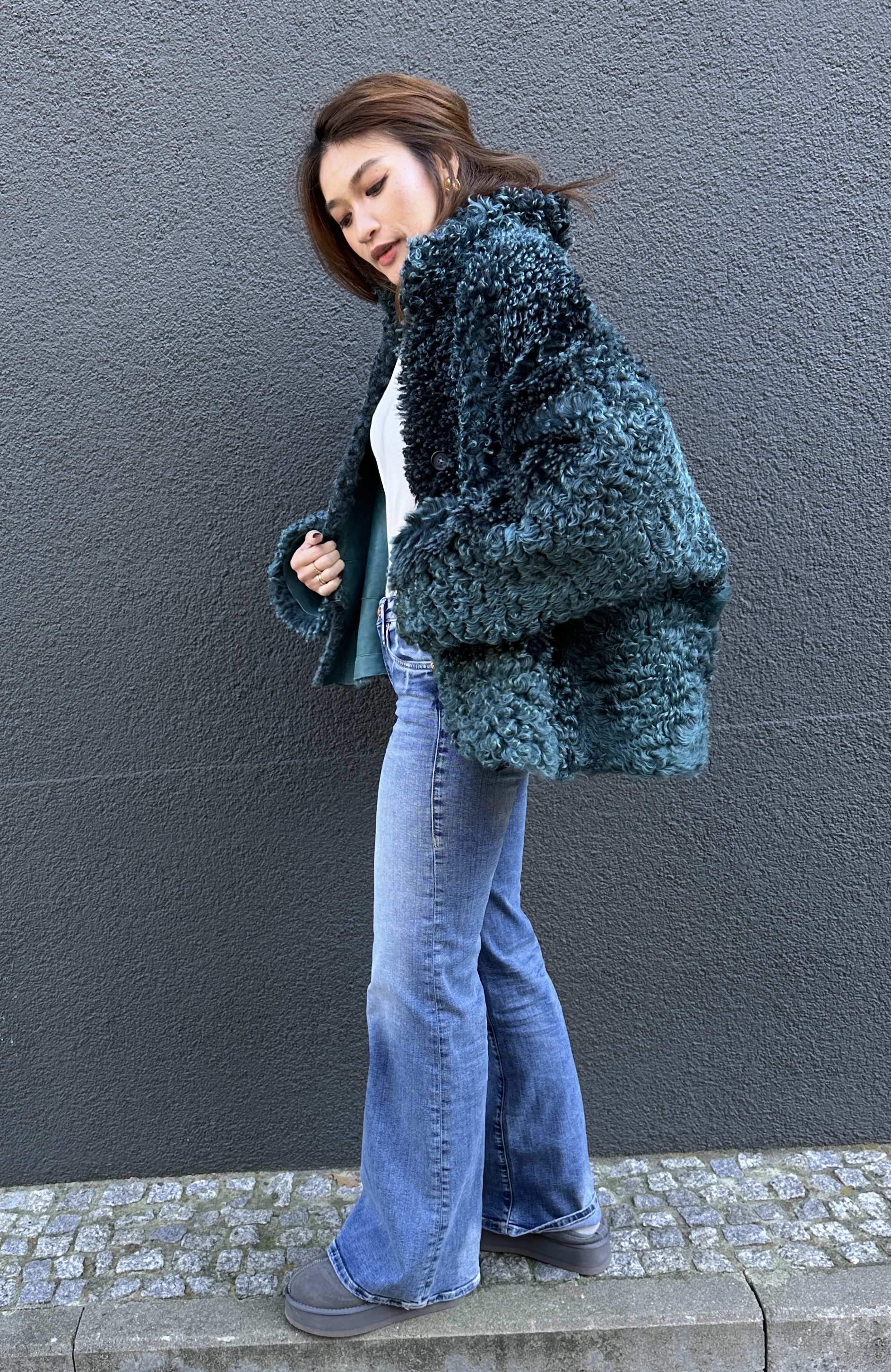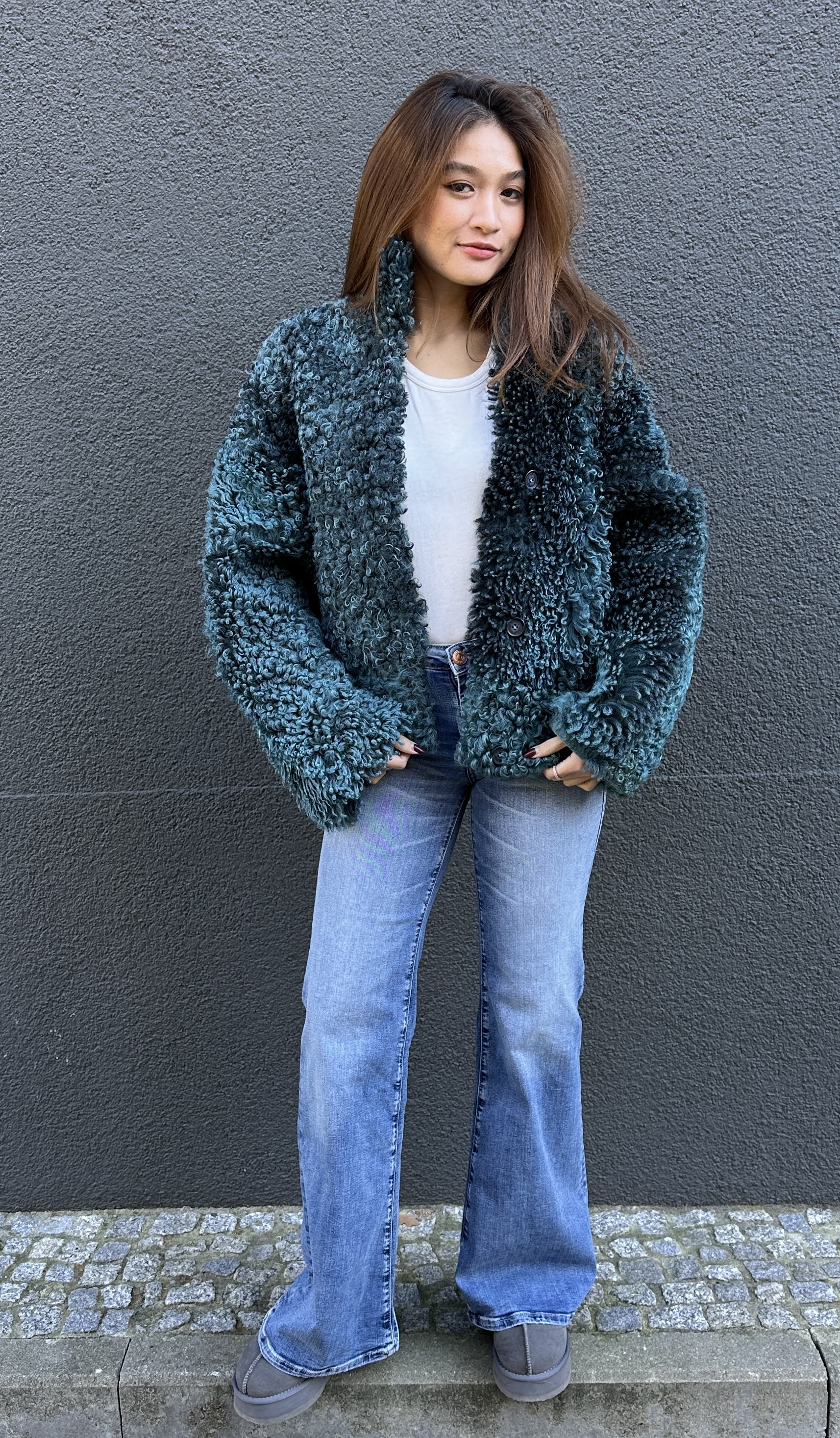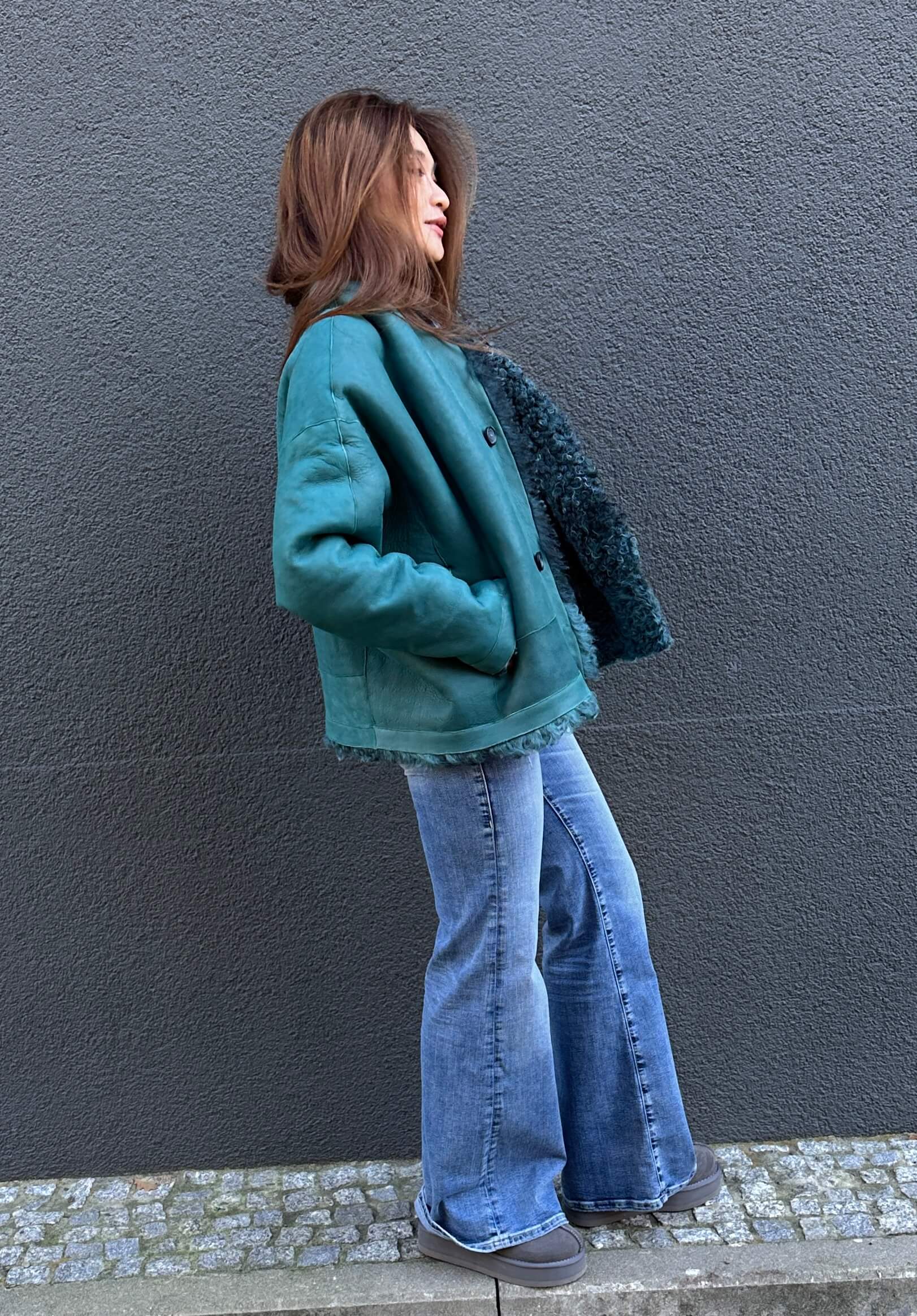 Coole Wende Lammfelljacke in Petrol mit Knöpfen und seitlichen Taschen. 100% Lammfell. Made in Griechenland. Fällt größengenau aus.