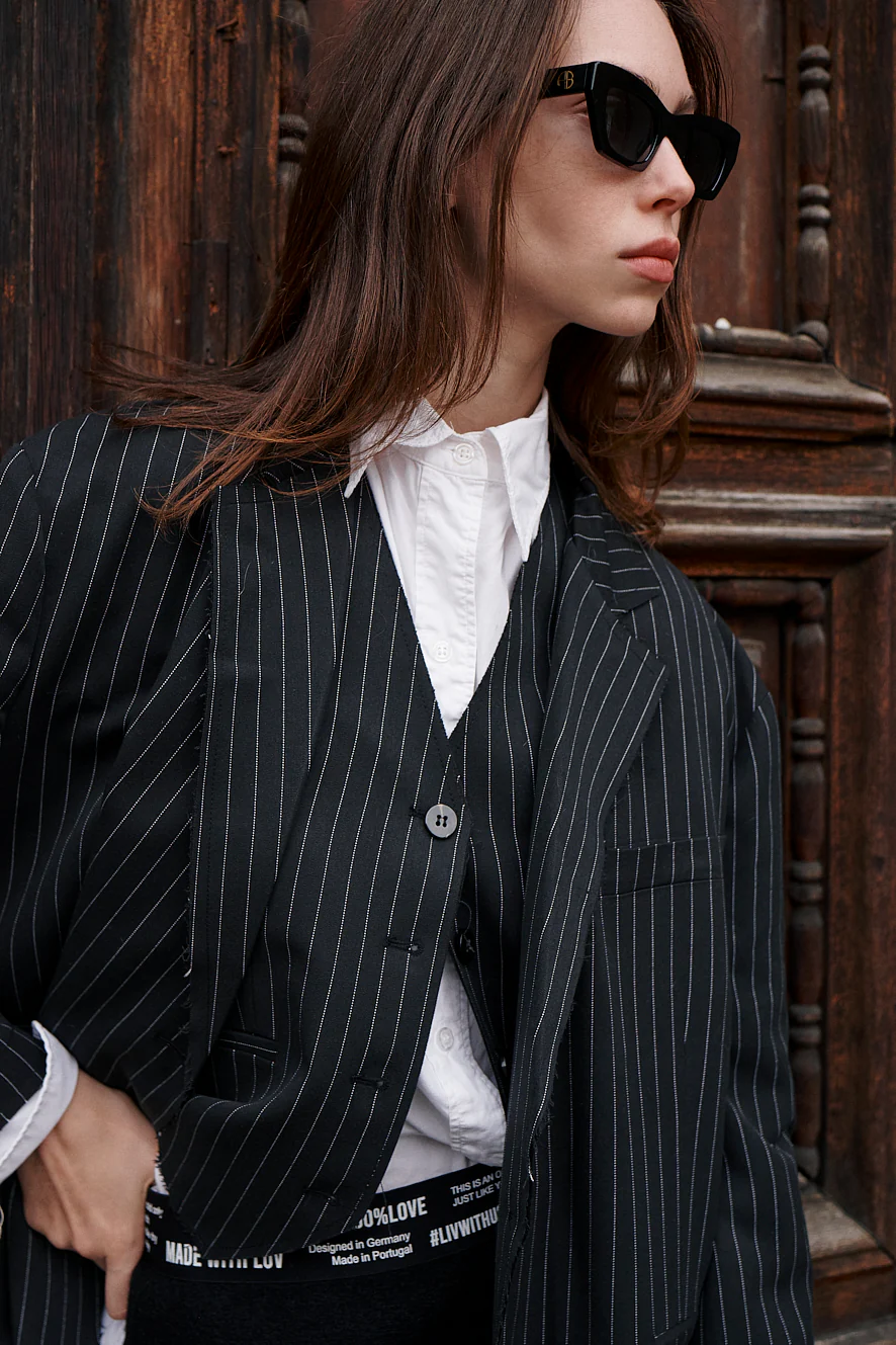 Lässiger Tailoring-Vibe, veredelt durch ein dezentes Weblabel mit Print am Ärmel – subtil, aber wirkungsvoll. Ein Statement für alle, die Stil und Individualität mühelos verbinden.