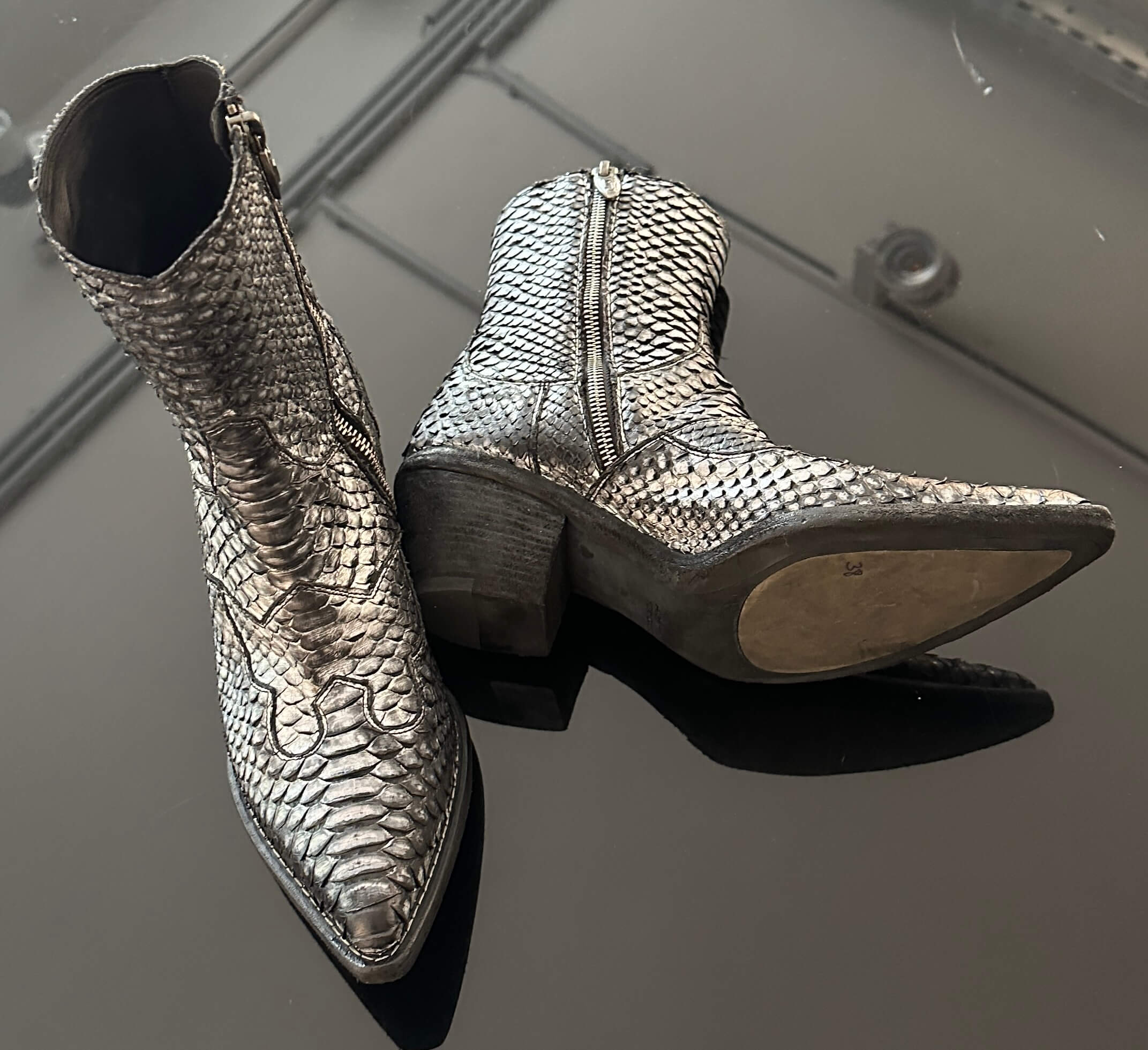 Coole Stiefletten aus laminiertem Phytonleder in Schwarz mit Silber, gefärbte Sohle, seitlicher Reißverschluss. 100% gewaschenes Leder. Handmade with Love in Italy. Fallen Größengenau aus, Absatz 4,0 cm