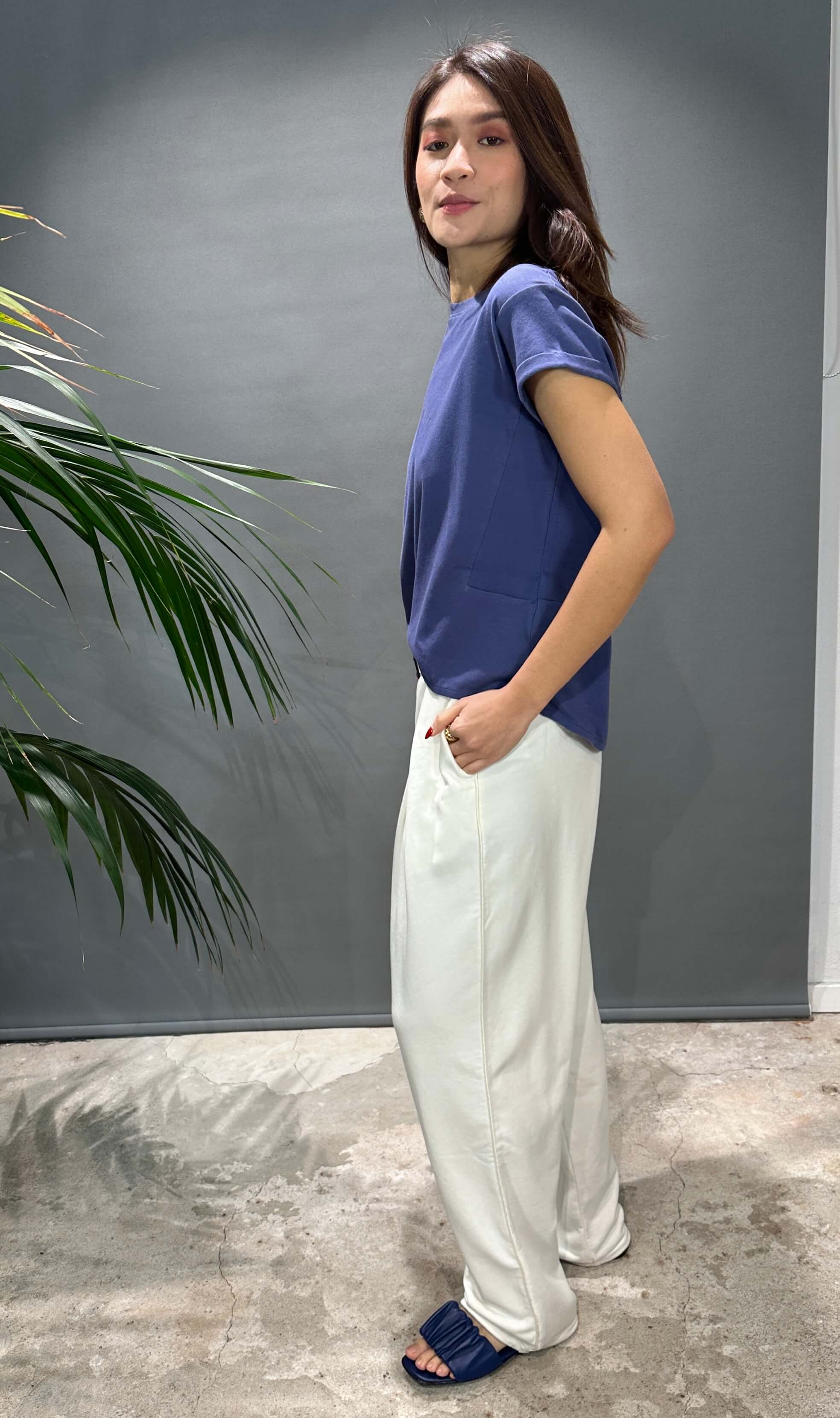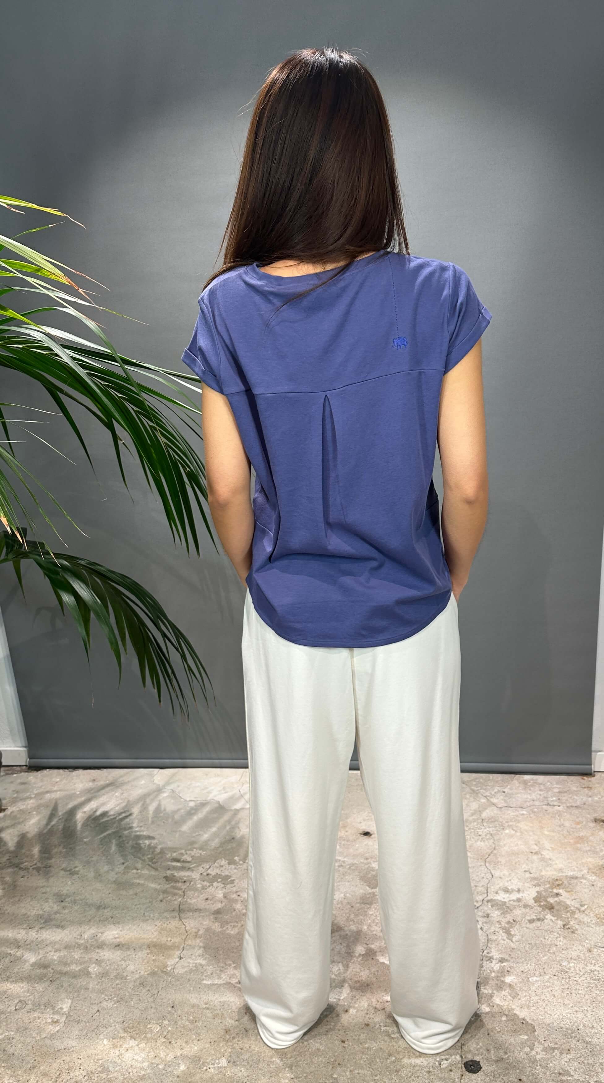 Cooles T-Shirt Lily in Skipper Blue mit Rundhalsausschnitt, Kellerfalte auf der Rückseite, Rippeinsatz an den Seiten, umgeschlagene Ärmel, kleines Elefanten Stitching.