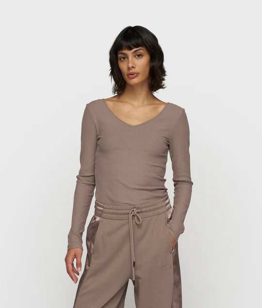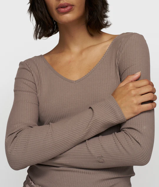 Slim Fit Longsleeve Top aus Rippenjersey aus weicher, GOTS-zertifizierter Bio-Baumwolle. Mit tiefem V-Ausschnitt, rundem Saum,