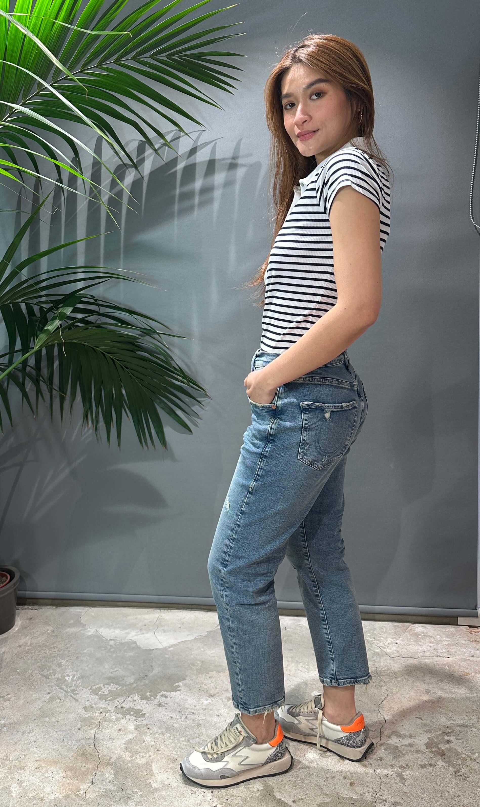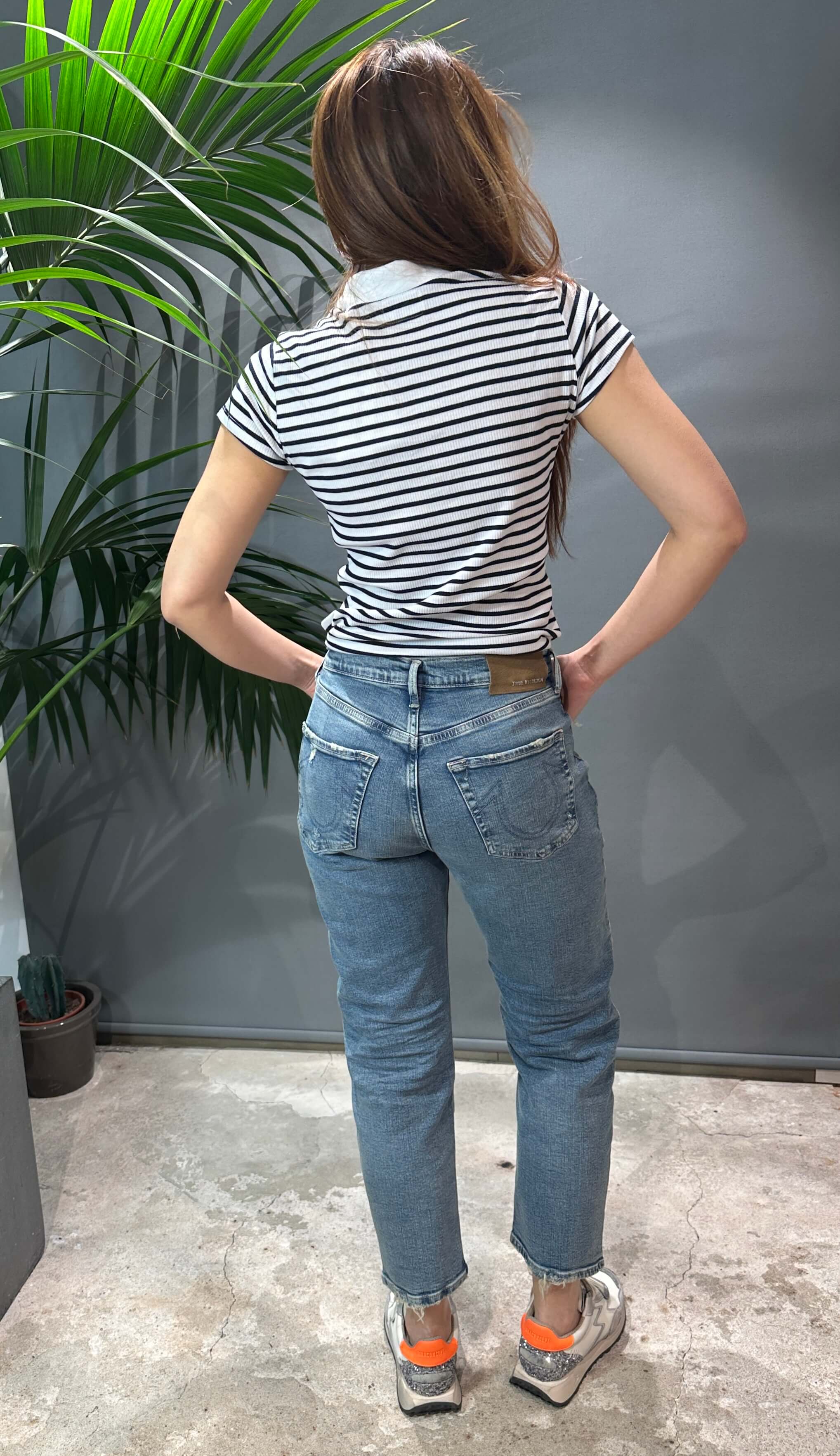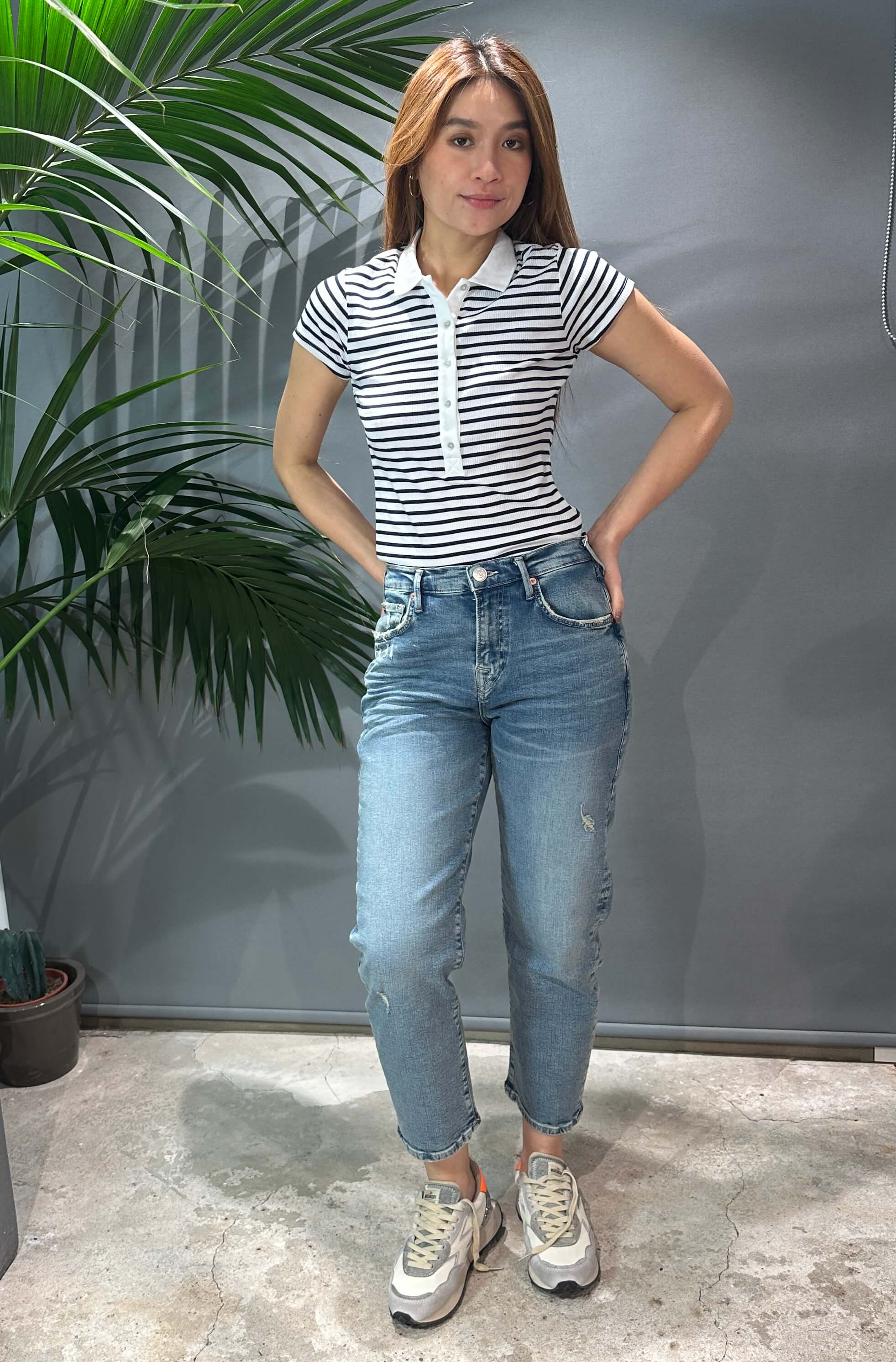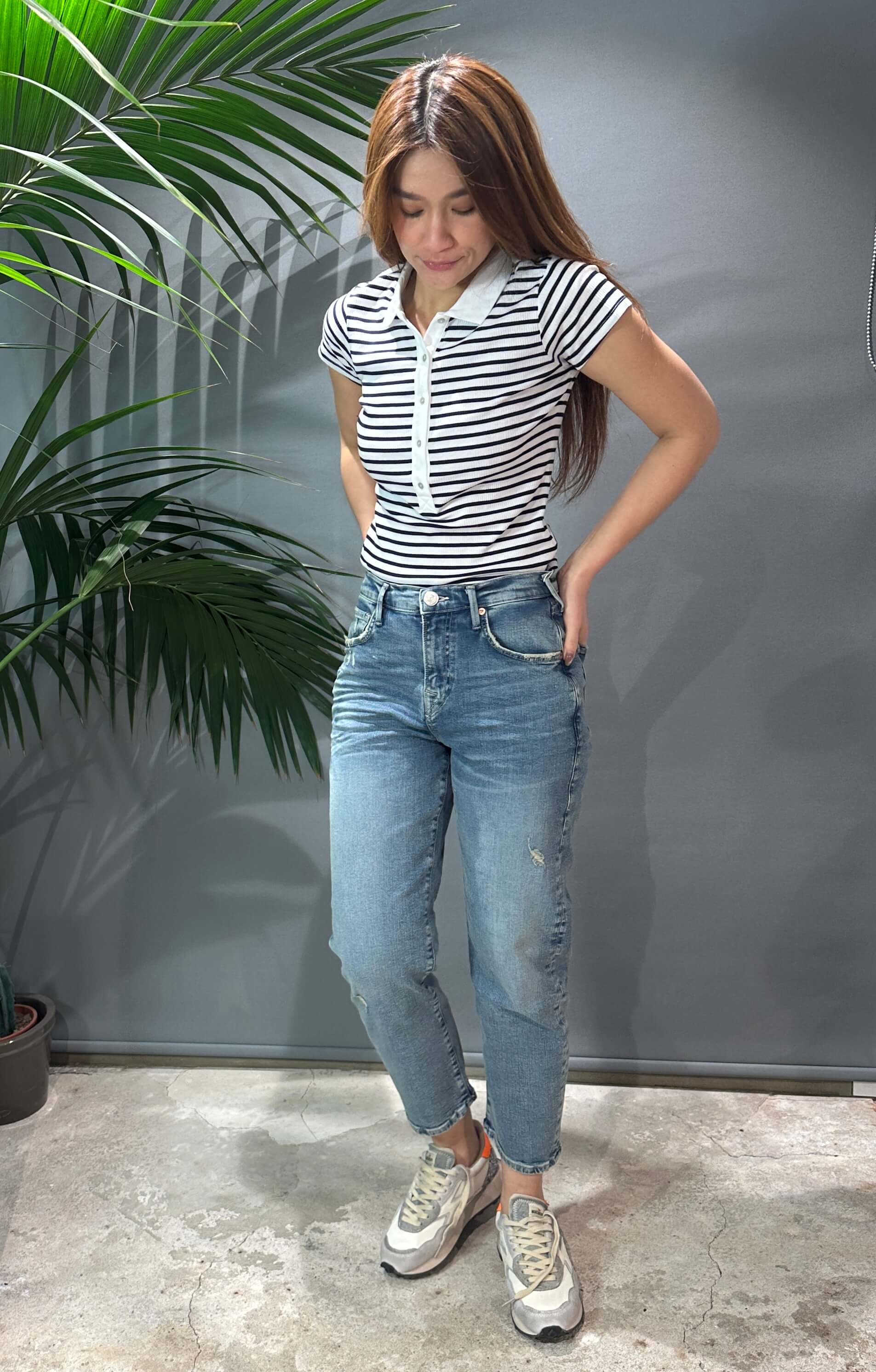 Cooles Ripppolo in Navy/Weiß gestreift mit langer Knopfleiste. 95% Baumwolle, 5% Elastan. Fällt größengenau aus.