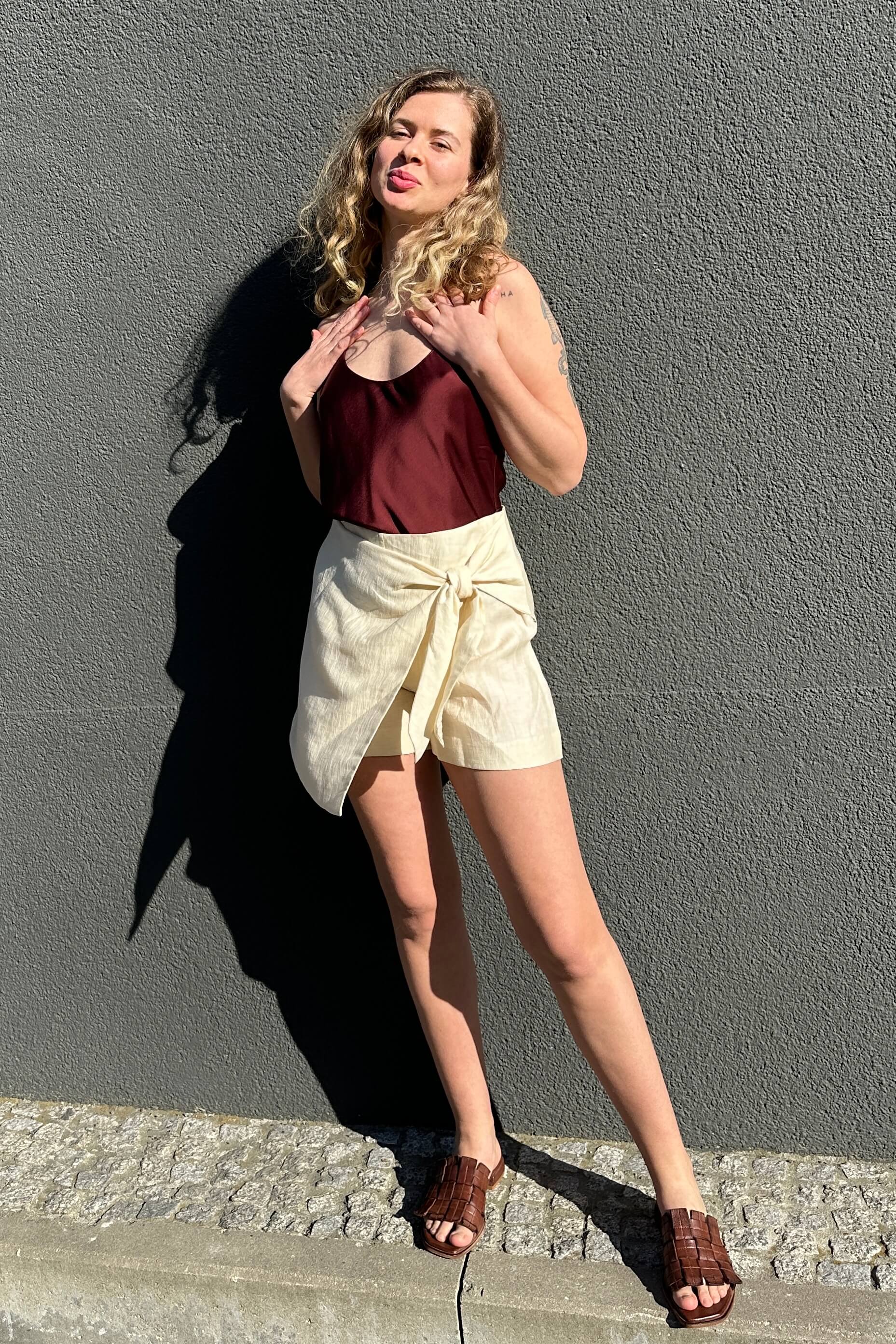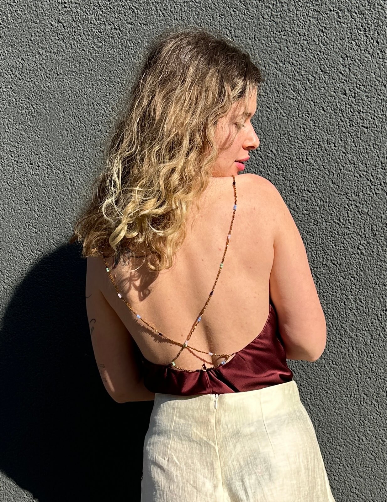 Edles Viscose Top in Merlot mit Perlenträgern. 100% Viscose. Fällt größengenau aus.