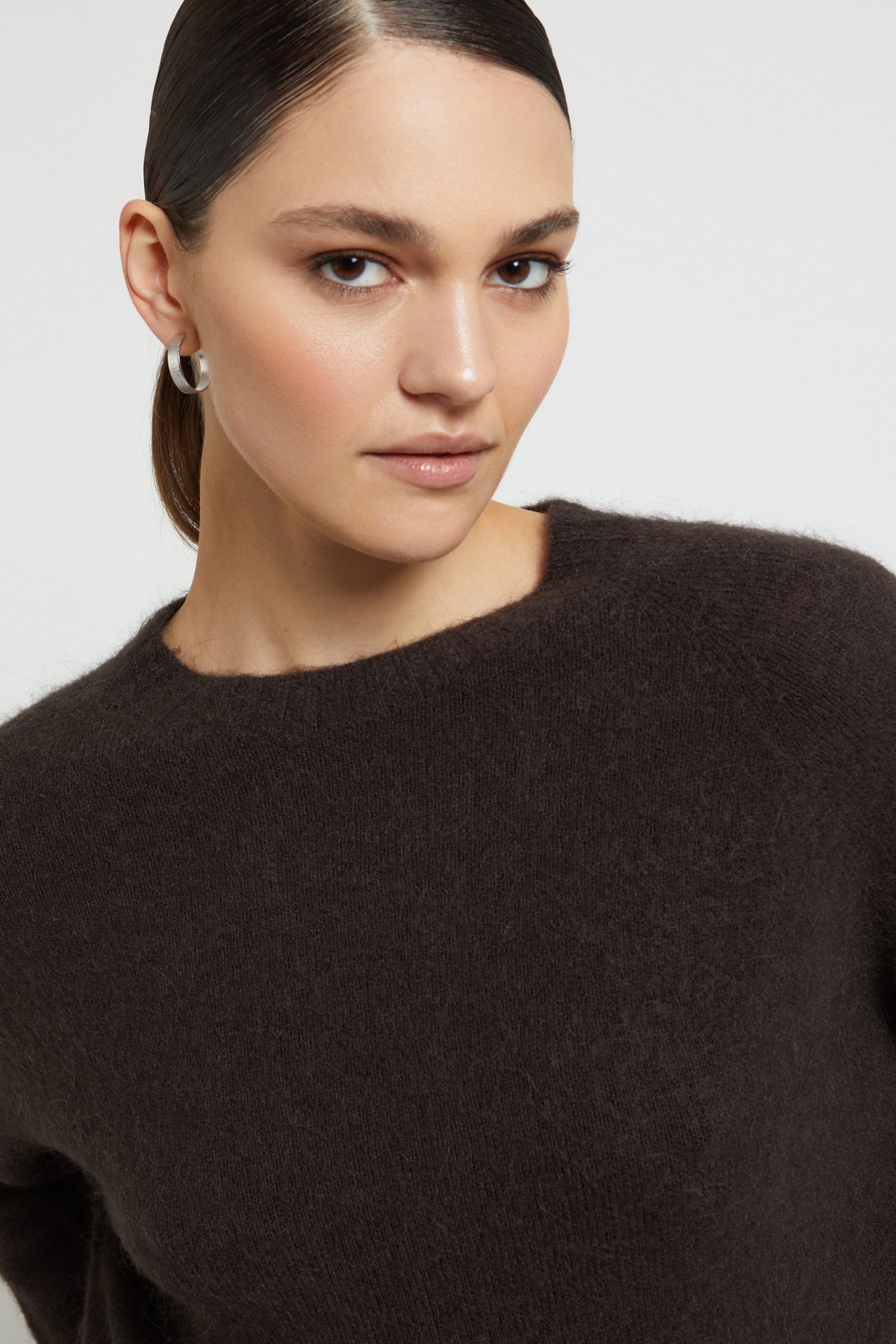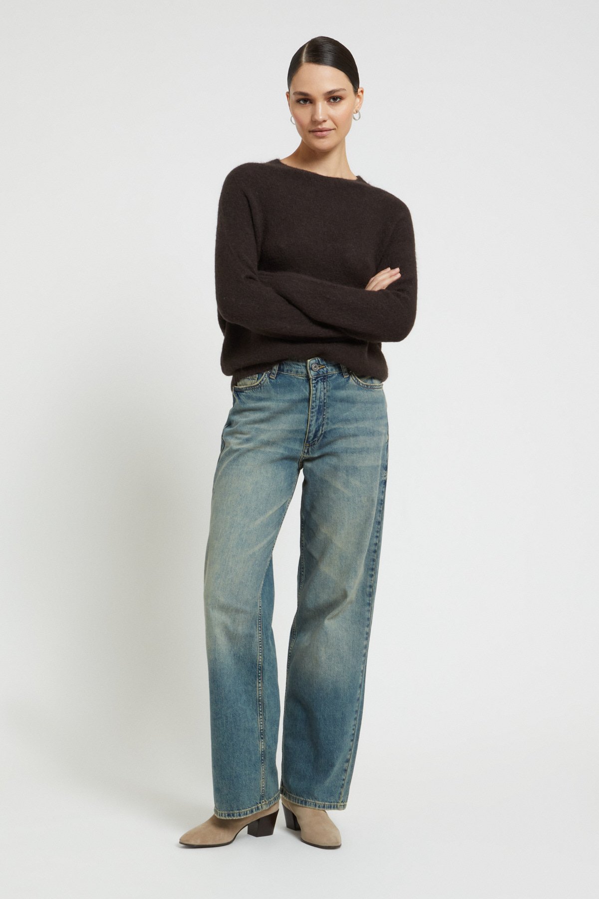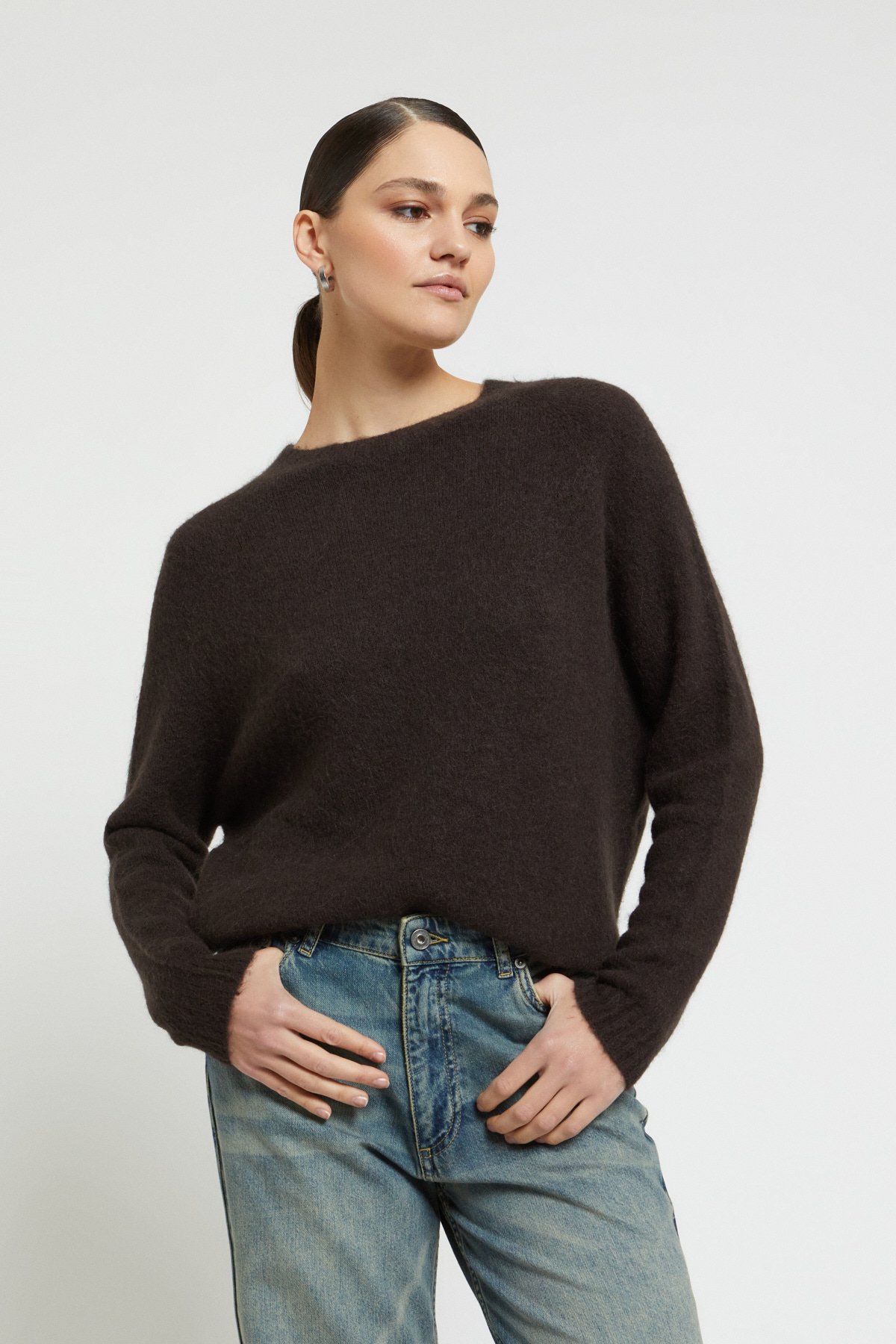 Pullover in Braun aus Wollmischung mit Rundhalsausschnitt.