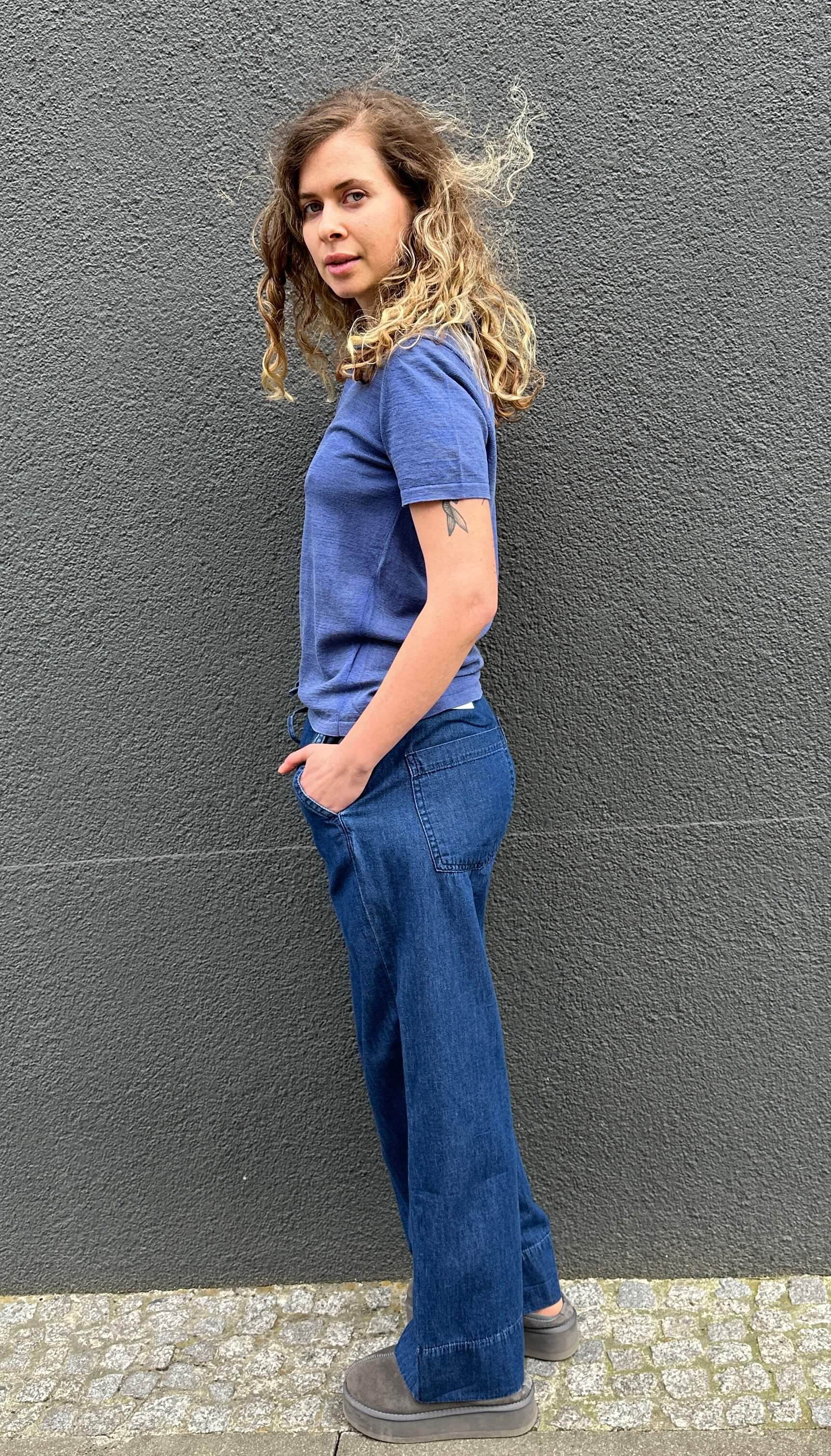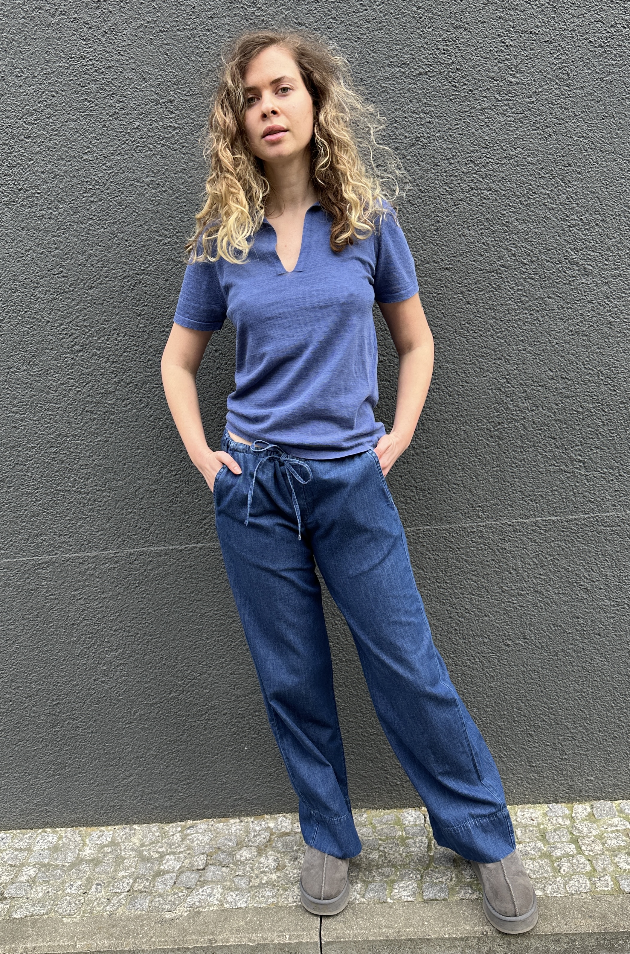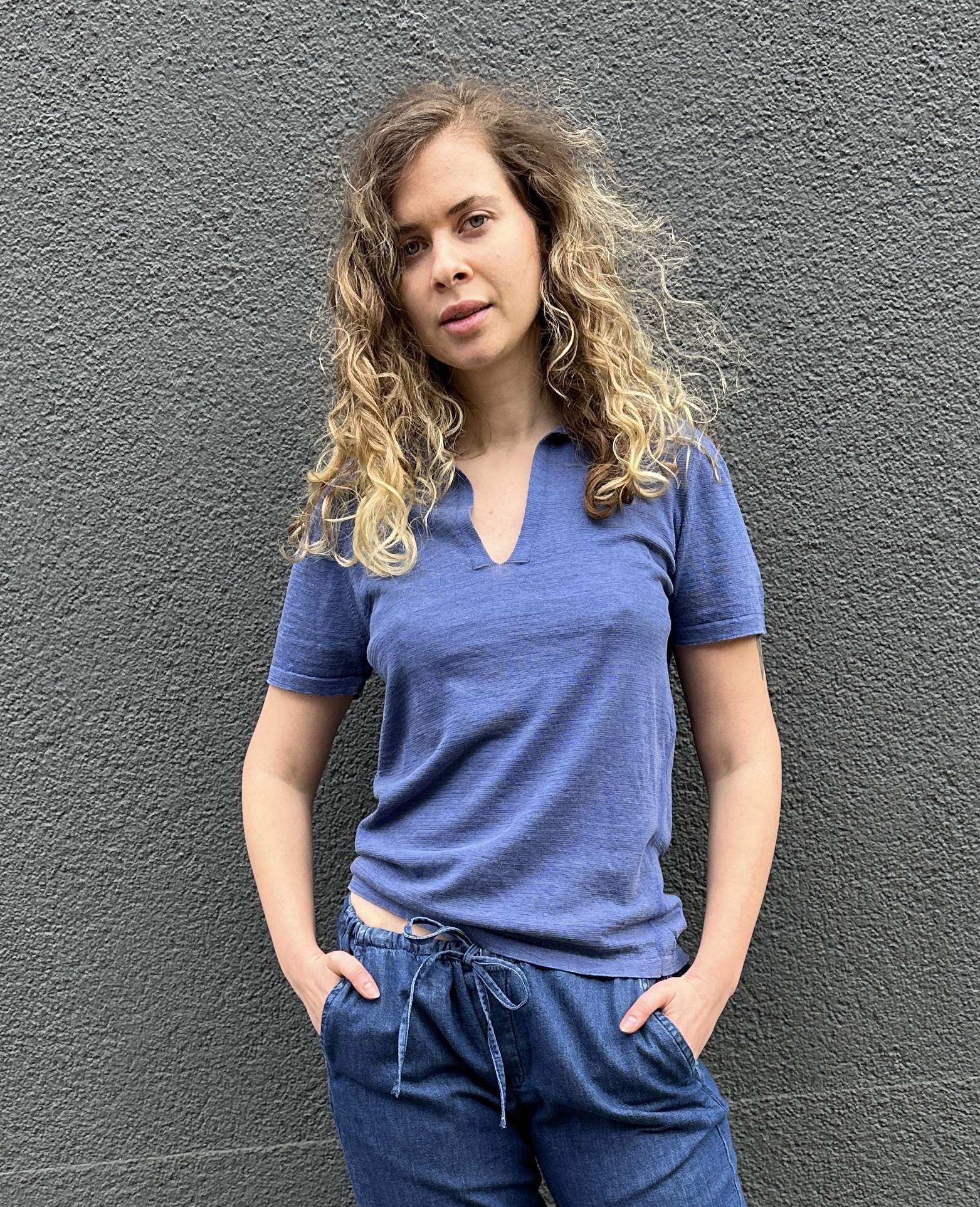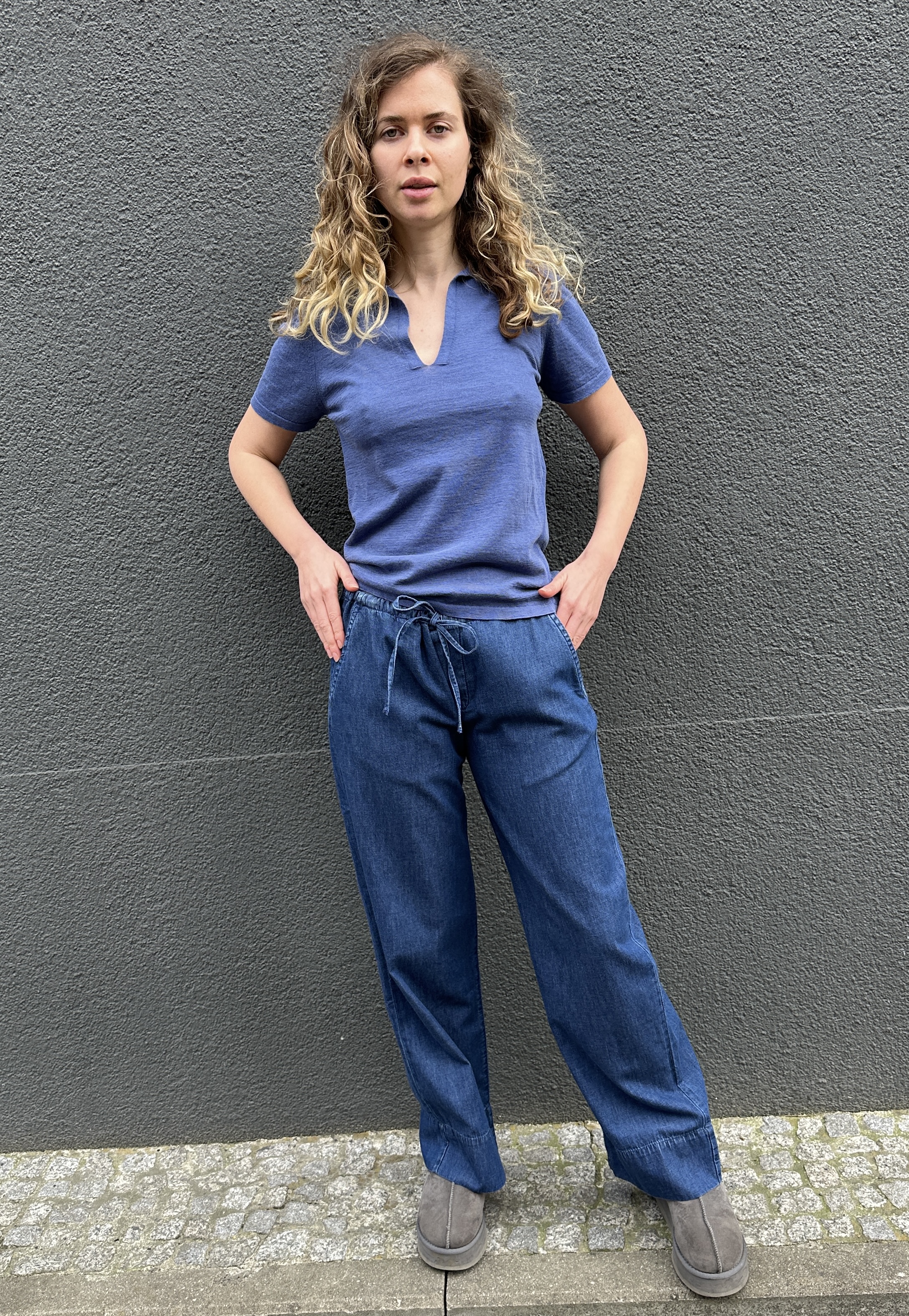 Edles Feinstrickpoloshirt in Denimblue mit Kragen und V-Ausschnitt. 67% Feine Baumwolle, 33% Leinen. Fällt größengenau aus. Handmade with Love in Italy