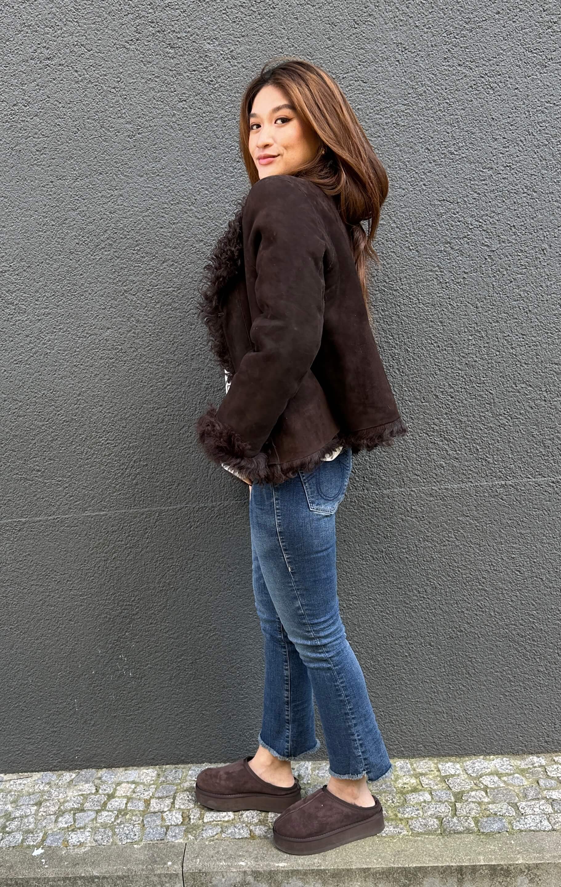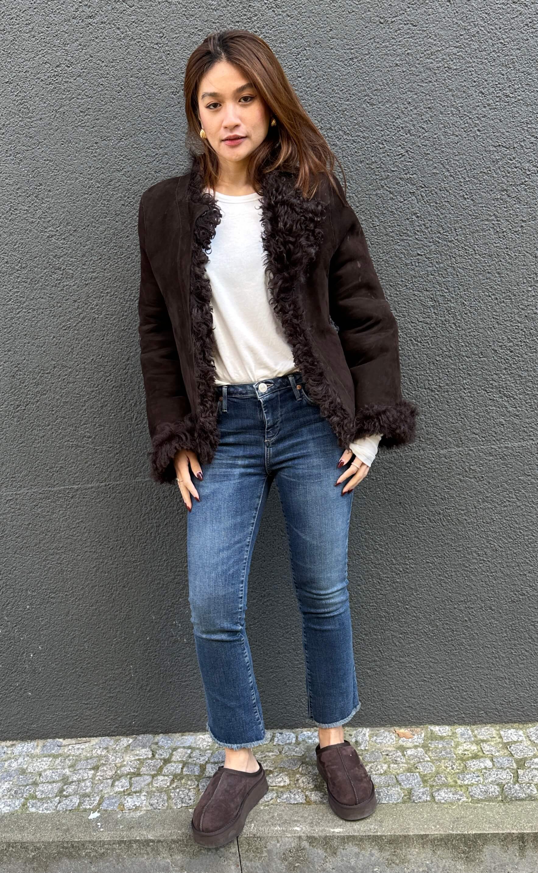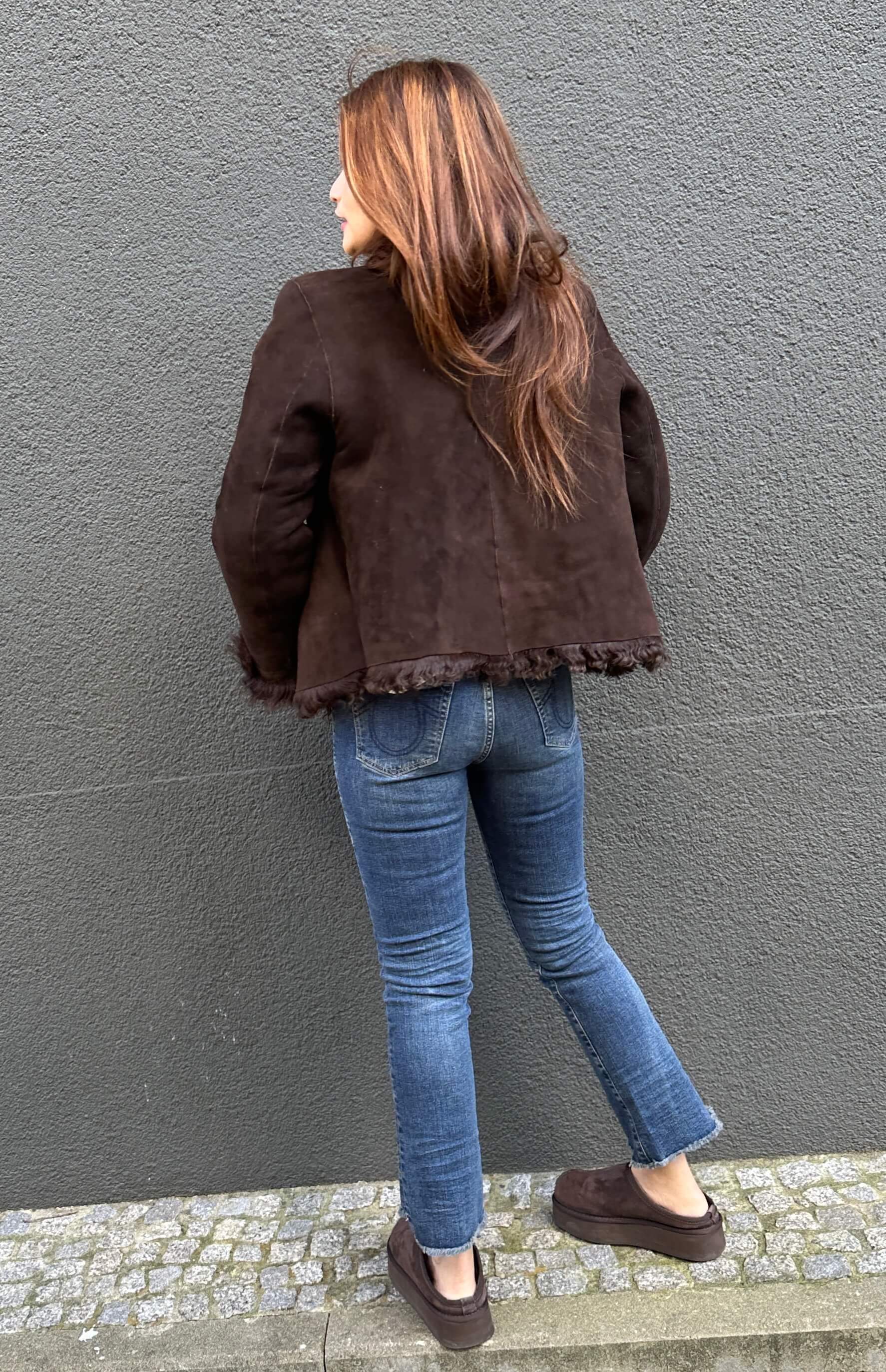 Coole Wende Lammfelljacke in Braun mit Hakenverschluss und seitlichen Taschen. 100% Lammfell. Made in Griechenland. Fällt größengenau aus.