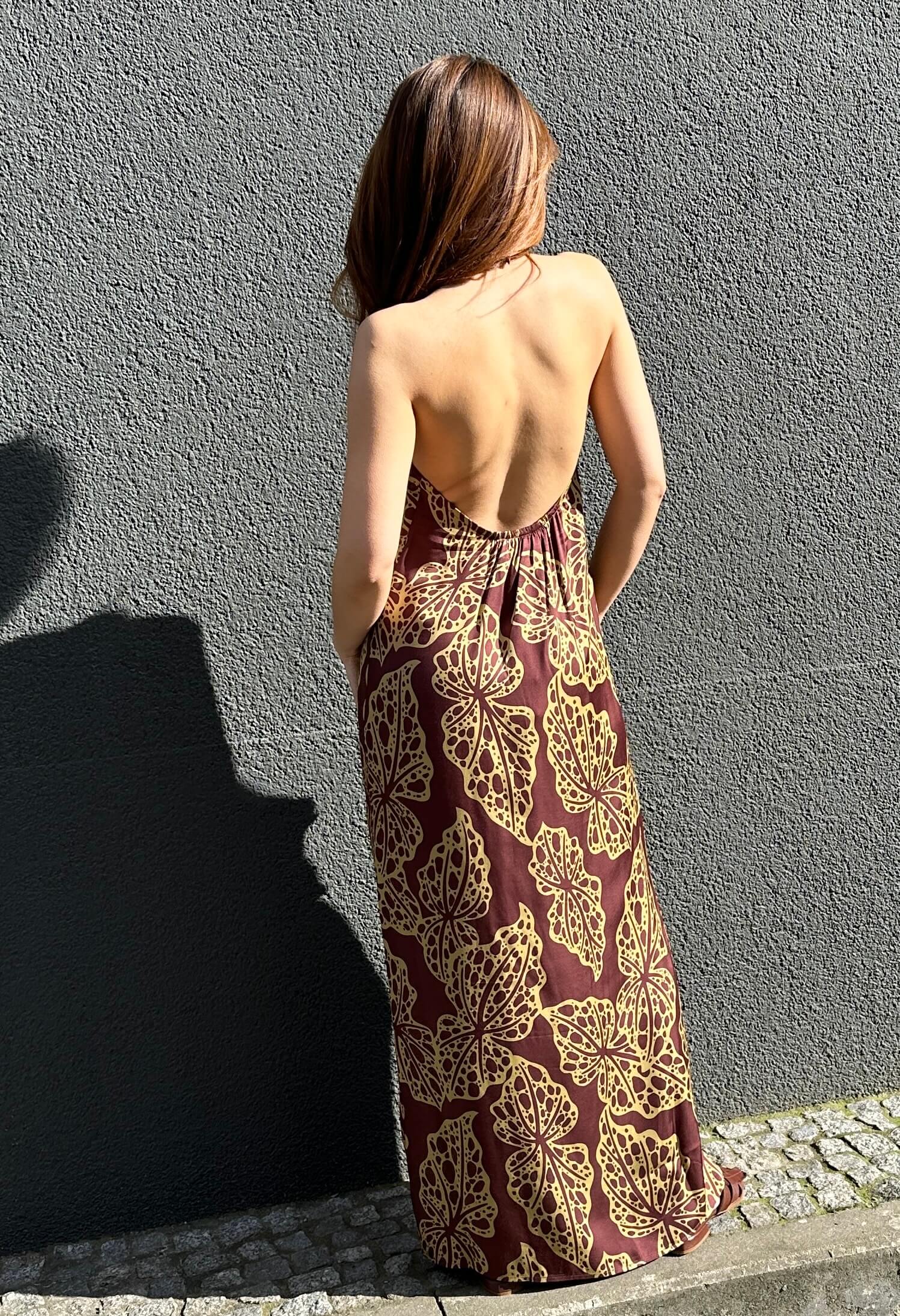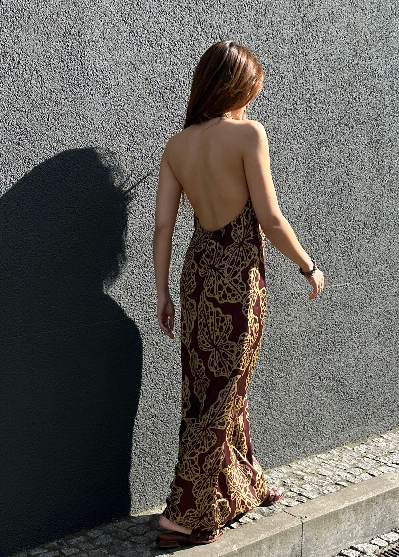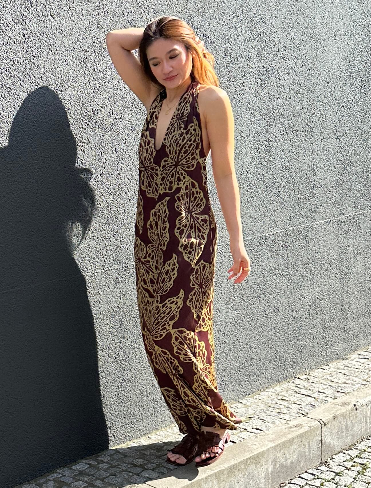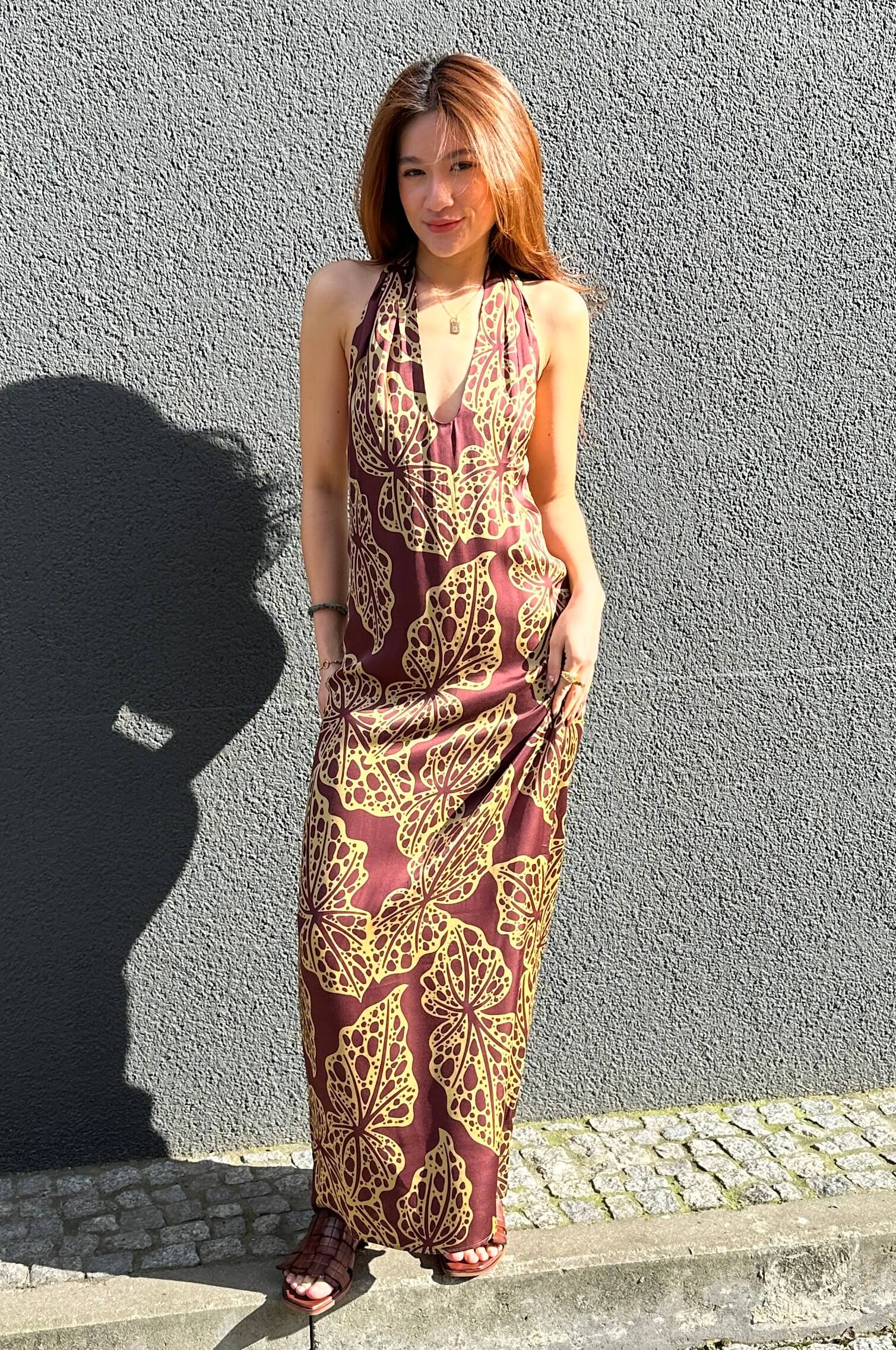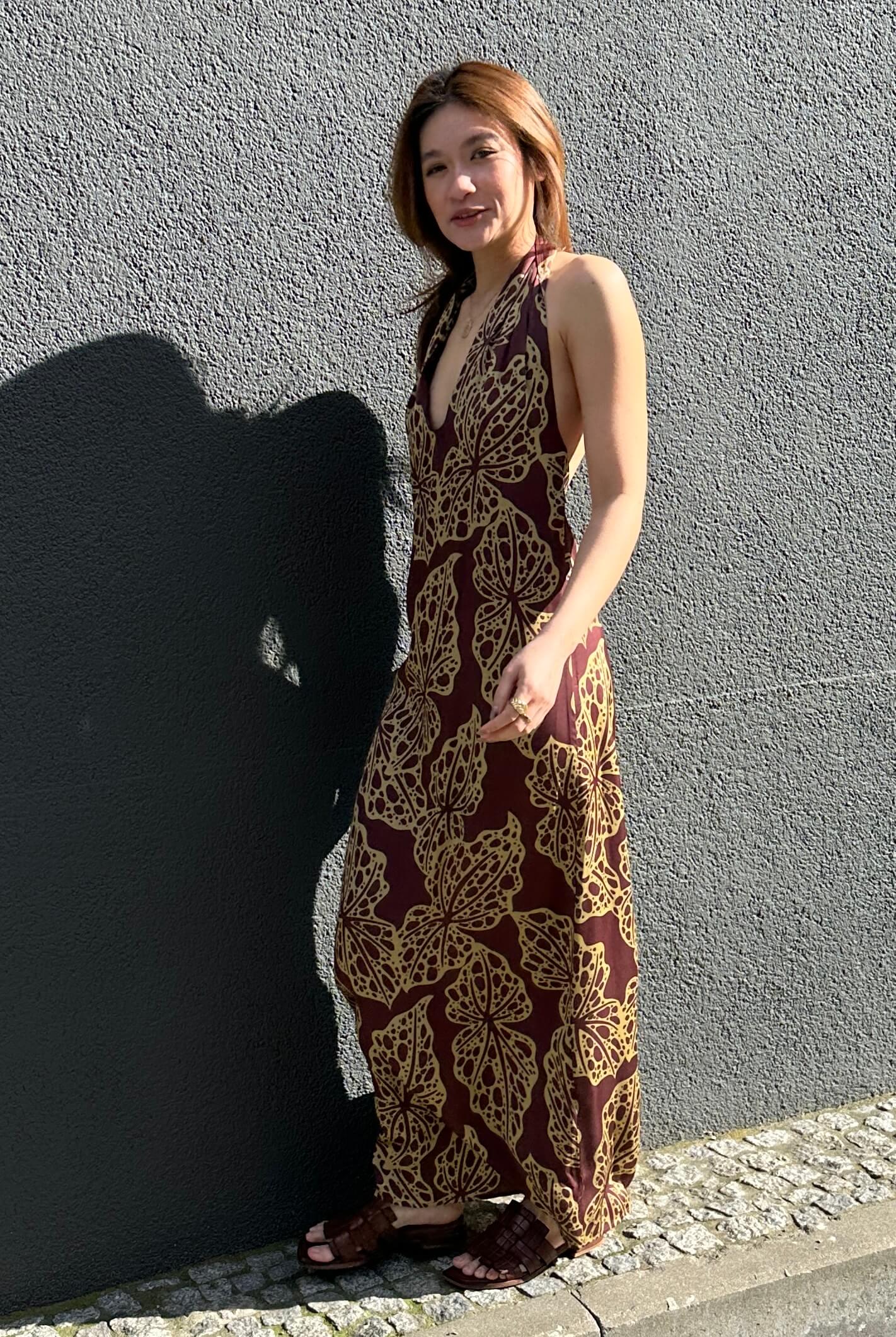 Langes Neckholder Kleid in Merlot mit Blütenprint in Camomilla. 100% Viscose. Fällt größengenau aus.