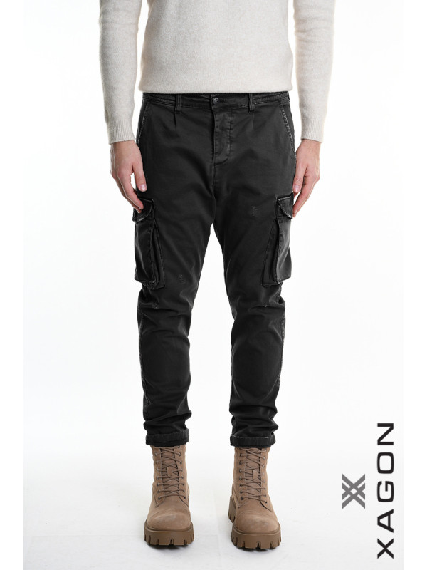 Coole Cargohose in Schwarz mit seitlichen Taschen und feinen destroyed Elementen. 97% Baumwolle, 3% Elastan. Fällt größengenau aus.
