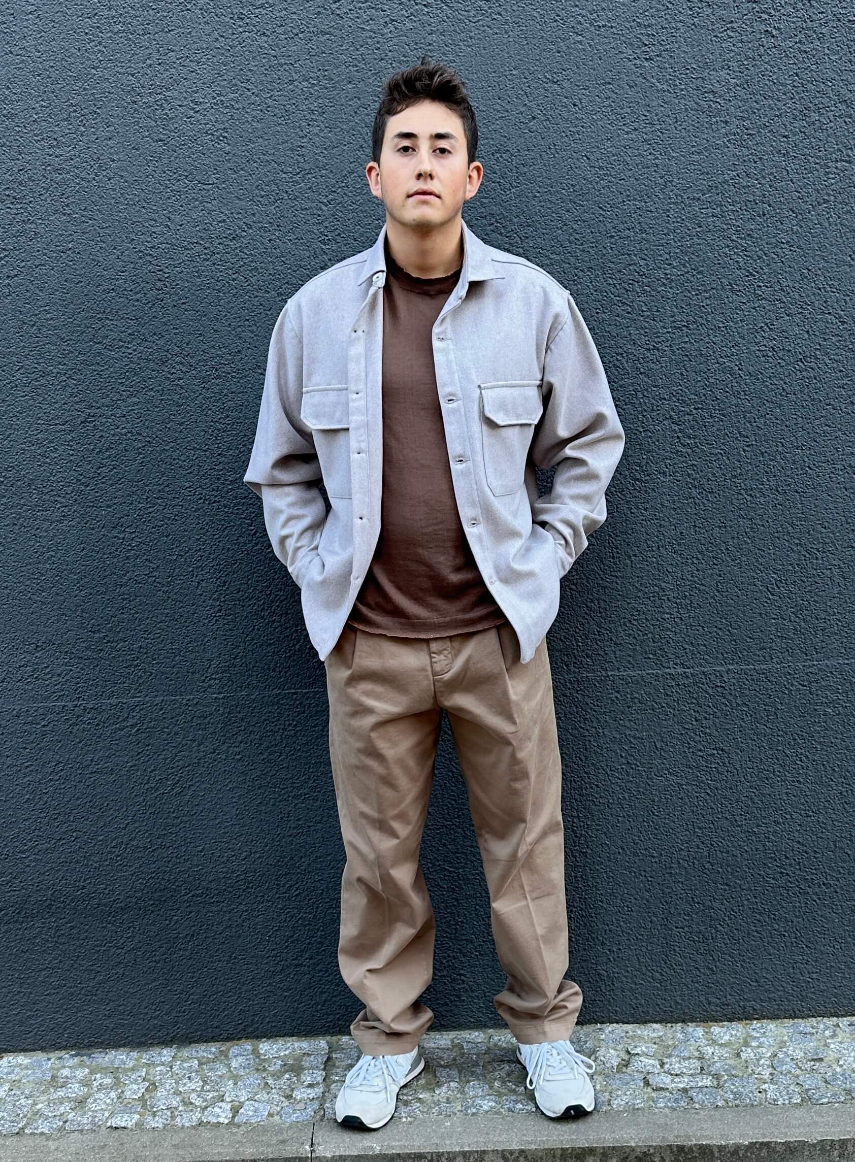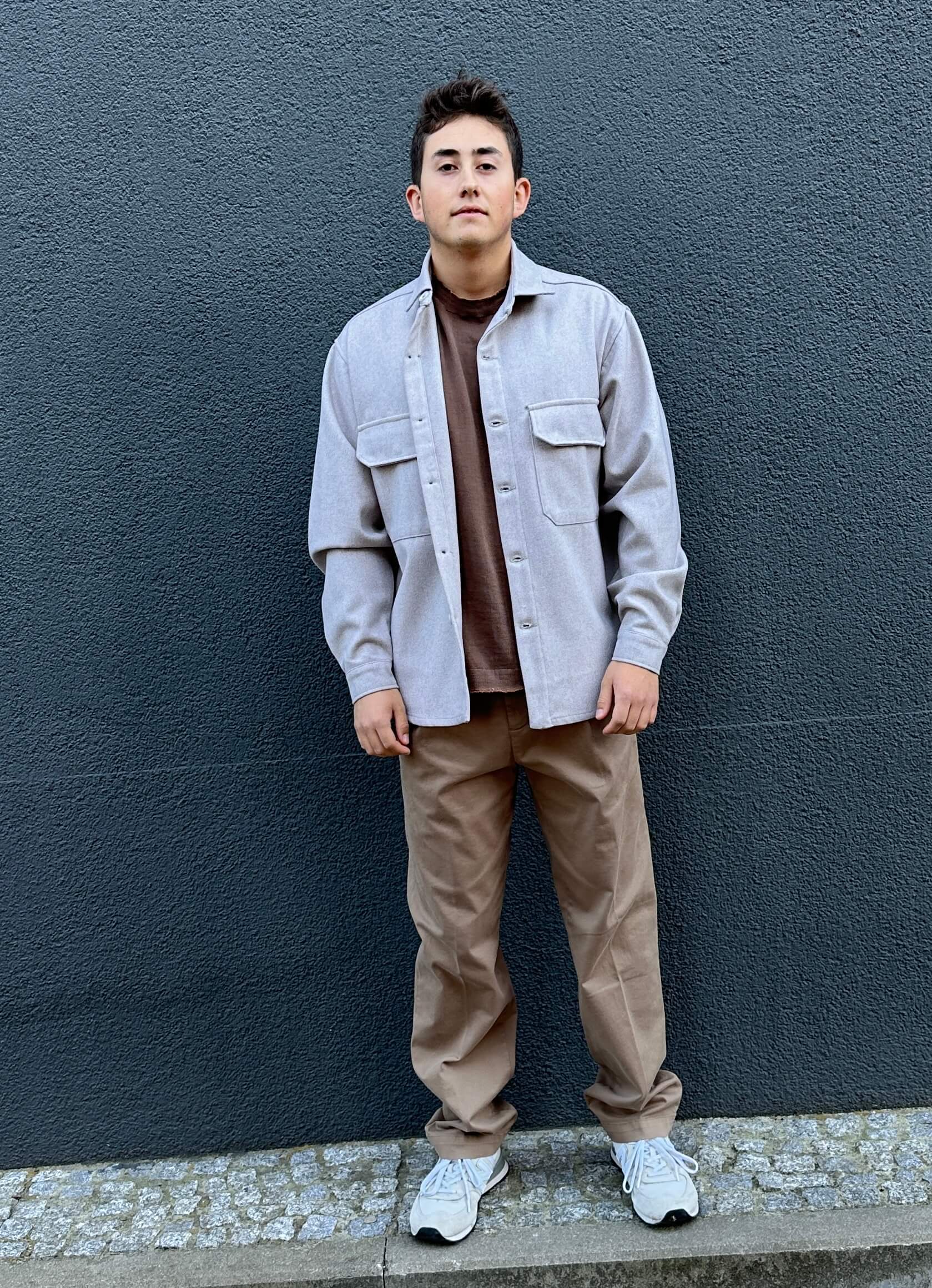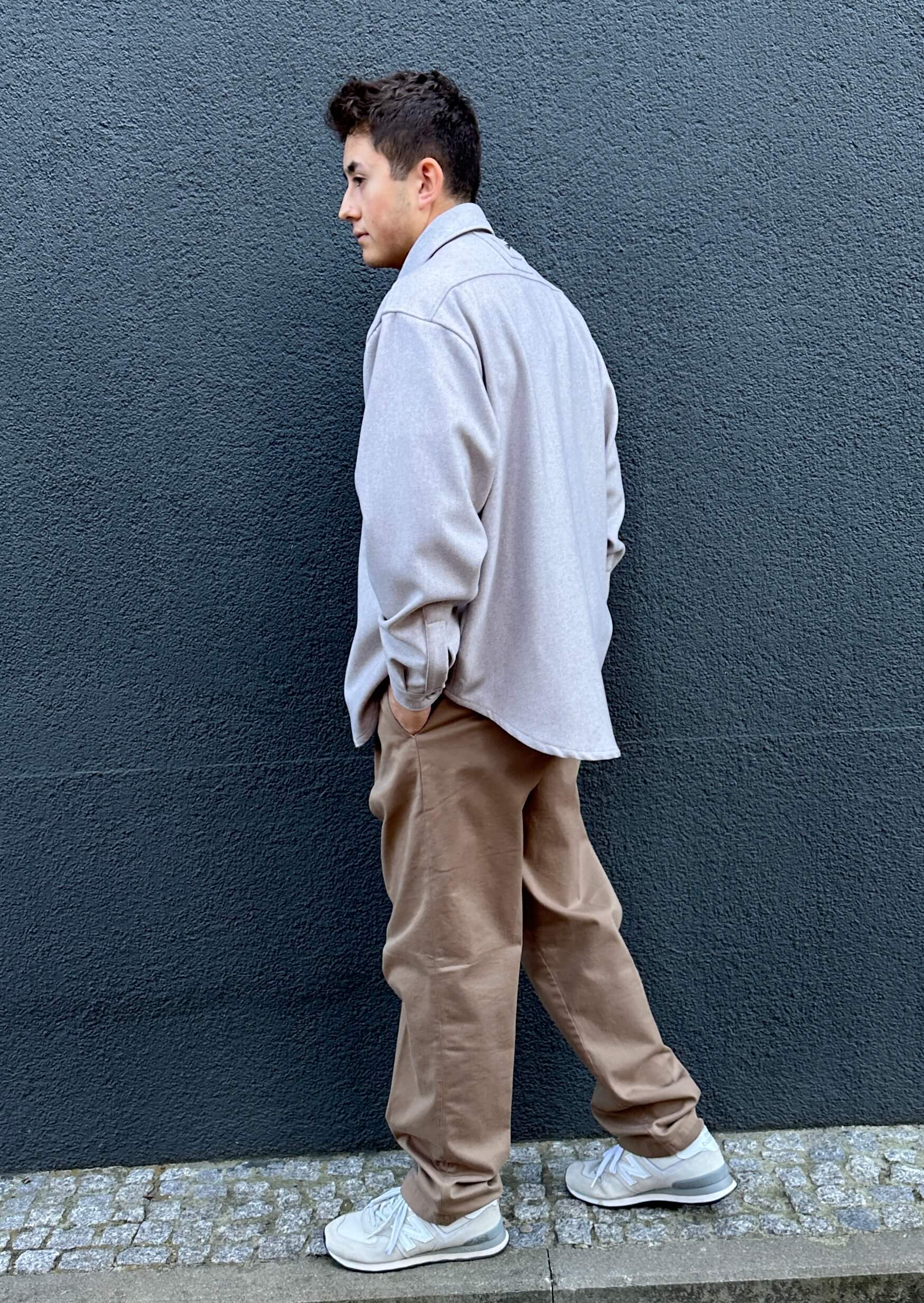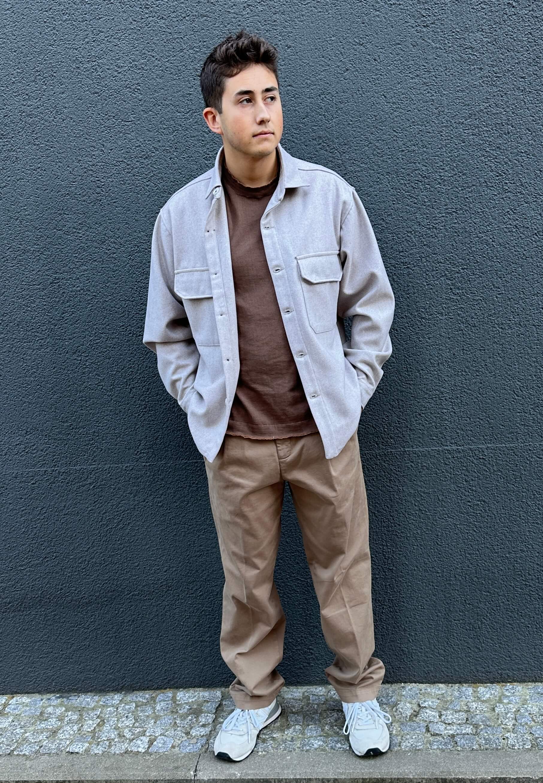 Cooles Overshirt in Sandmelange mit Knöpfen, Brusttaschen mit Druckknöpfen. 50% Wolle, 40% Polyester, 10% Sontige Fasern. Fällt größengenau aus.